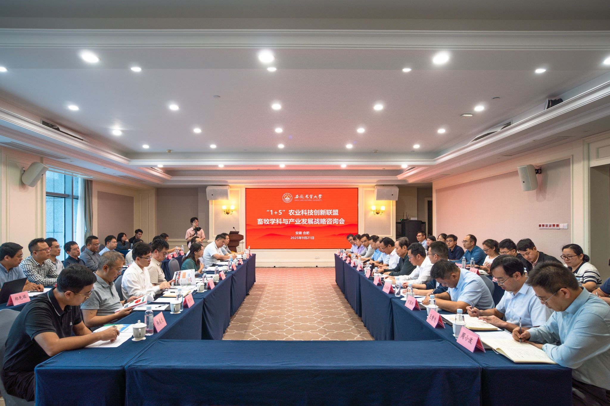 本网讯 9月21日下午,“1+5”农业科技创新联盟畜牧学科与产业发展战略咨询会在合肥举行。校党委副书记、校长操海群,学术副校长吴文革出席会议并全程指导工作。中国农业科学院北京畜牧兽医研究所、中国农业大学动物科技学院、西北农林科技大学动物科技学院、华中农业大学动物科技学院动物医学院、南京农业大学动物科技学院、安徽省农业农村厅、安徽省农业科学院畜牧兽医研究所、安徽科技学院动物科技学院等单位负责同志应邀参会。学校社合处、科技处、发展规划处、动物科技学院相关负责人和团队代表参会。