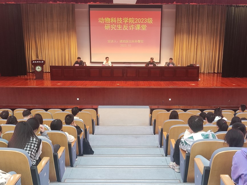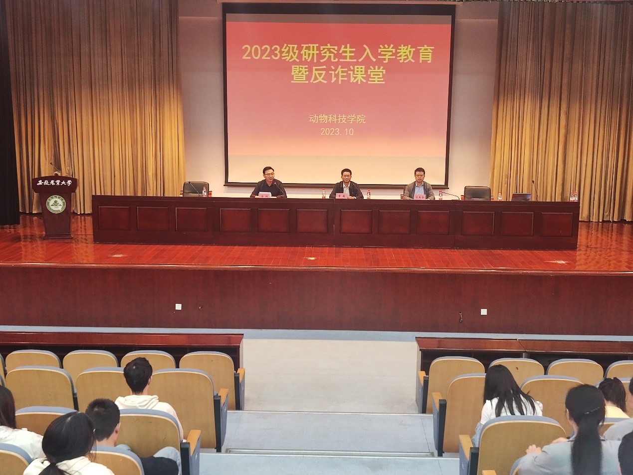 本网讯 金色十月,阳光明媚,秋风送爽,硕果飘香。为进一步加强研究生管理,培养研究生“大国三农”情怀,10月13日上午,动物科技学院在图书馆第一报告厅举行2023级研究生入学教育暨反诈课堂。学院党委副书记章巍、副院长凌英会、琥珀派出所孙警官、2023级研究生辅导员出席本次大会,会议由学院副院长涂健主持。