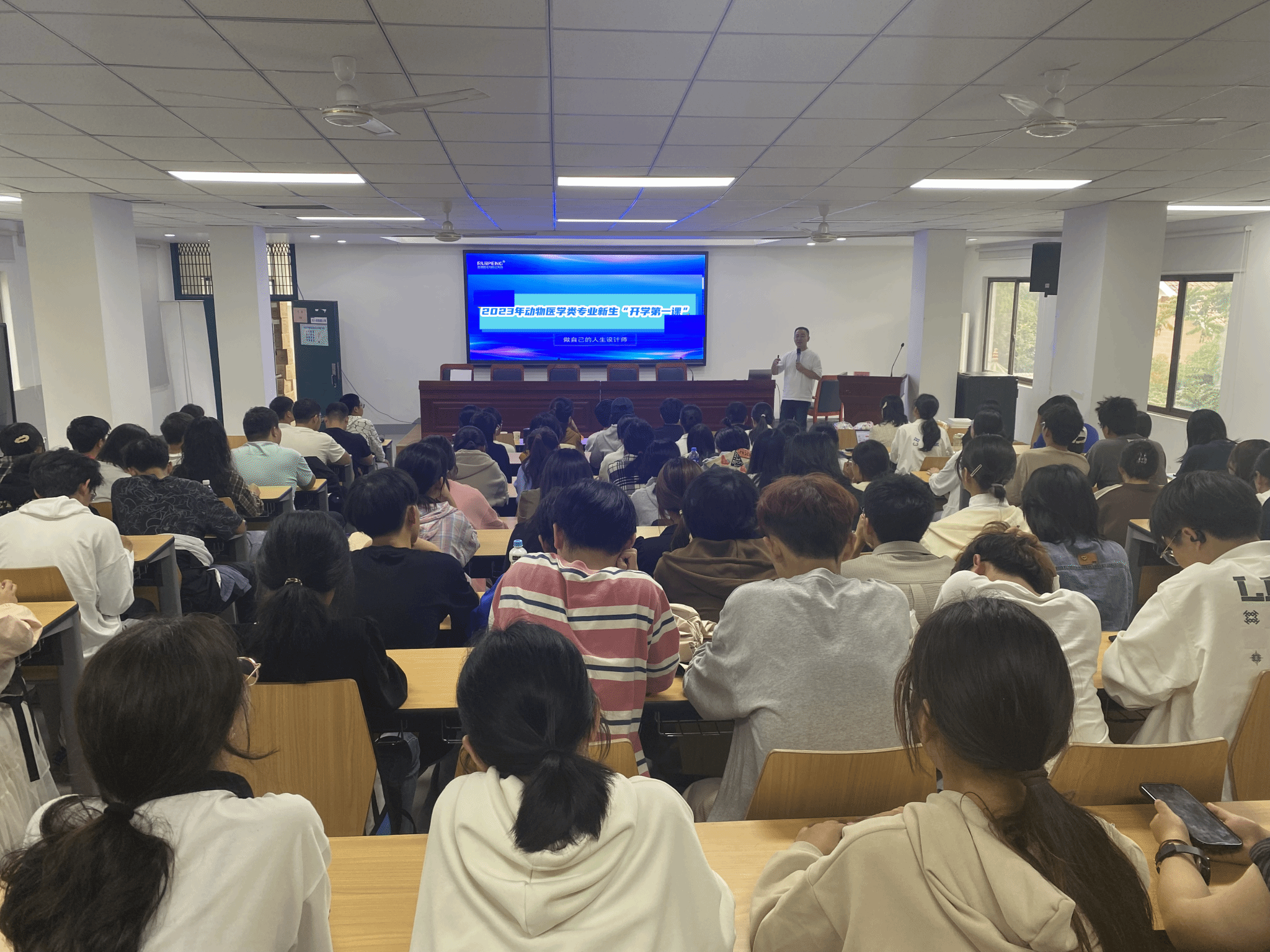 报告中,胡旺庭从学生的角色转变、宠物医疗行业发展趋势、宠物诊疗行业优缺点以及发展前景等多方面进行详细讲述。他指出,宠物医疗行业已经成为人们生活不可或缺的一部分,行业发展需要专业人才。通过介绍,加深了大一新生们对宠物医疗及其相关领域的了解,激发了同学们对专业学习的深厚兴趣。作为曾经的动科学子,他时刻关注母校的变化和发展,并分享了自己学生时代和工作期间的生活经历,语重心长地为同学们上了一堂“励志课”,重点强调了大学期间的课程与工作后的相关性,鼓励大家勇于迈出去限制自身发展的藩篱,主动融入新时代的行业发展潮流。他鼓励学弟学妹们:一要厚植家国情怀,坚定理想信念,把爱国心转化为报国志、强国行;二要勤奋学习,培养刻苦钻研的敬业态度,成为专业技术过硬的新时代青年;三要保持积极向上的心态、善于思考的劲头,不断提升贡献社会的本领。