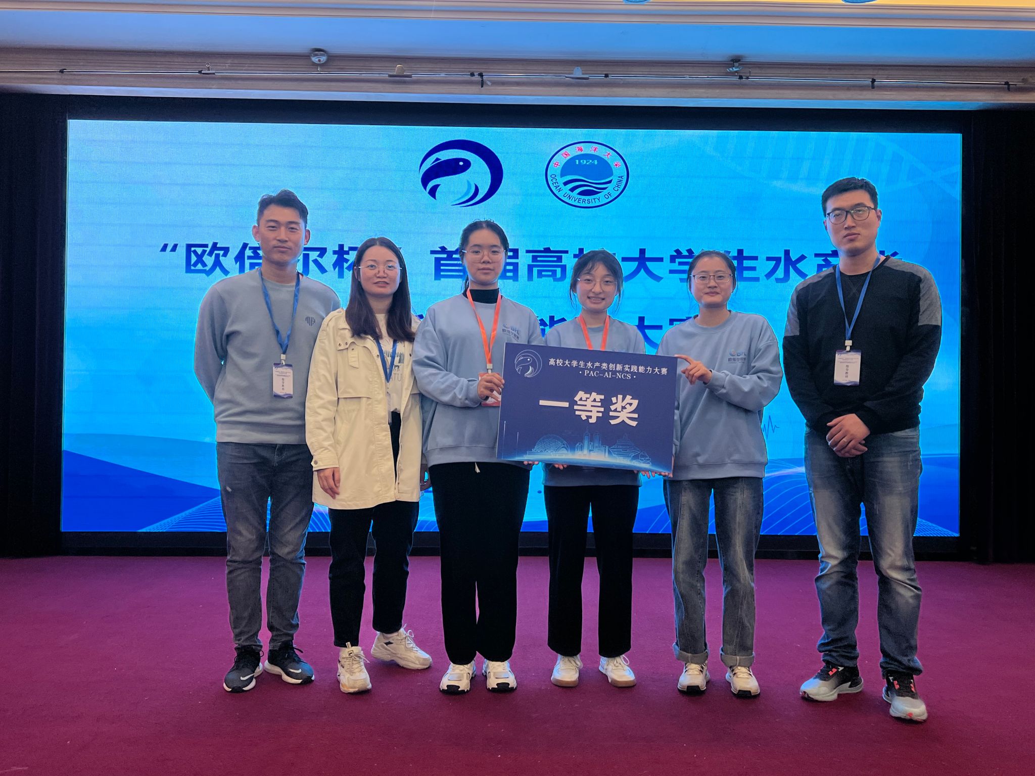本网讯 11月3日至4日,由中国水产学会指导、水产科学国家级实验教学示范中心和中国海洋大学水产学院承办的“欧倍尔杯”首届高校大学生水产类创新实践能力大赛在中国海洋大学举办。安徽农业大学动物科技学院水产系教师朱若林、许然和陈啸带领21级本科生迟浩淼、付萍、章彩云同学参赛。经过激烈角逐,学院代表队在全国水产类高校中脱颖而出,获得团队一等奖的优异成绩。