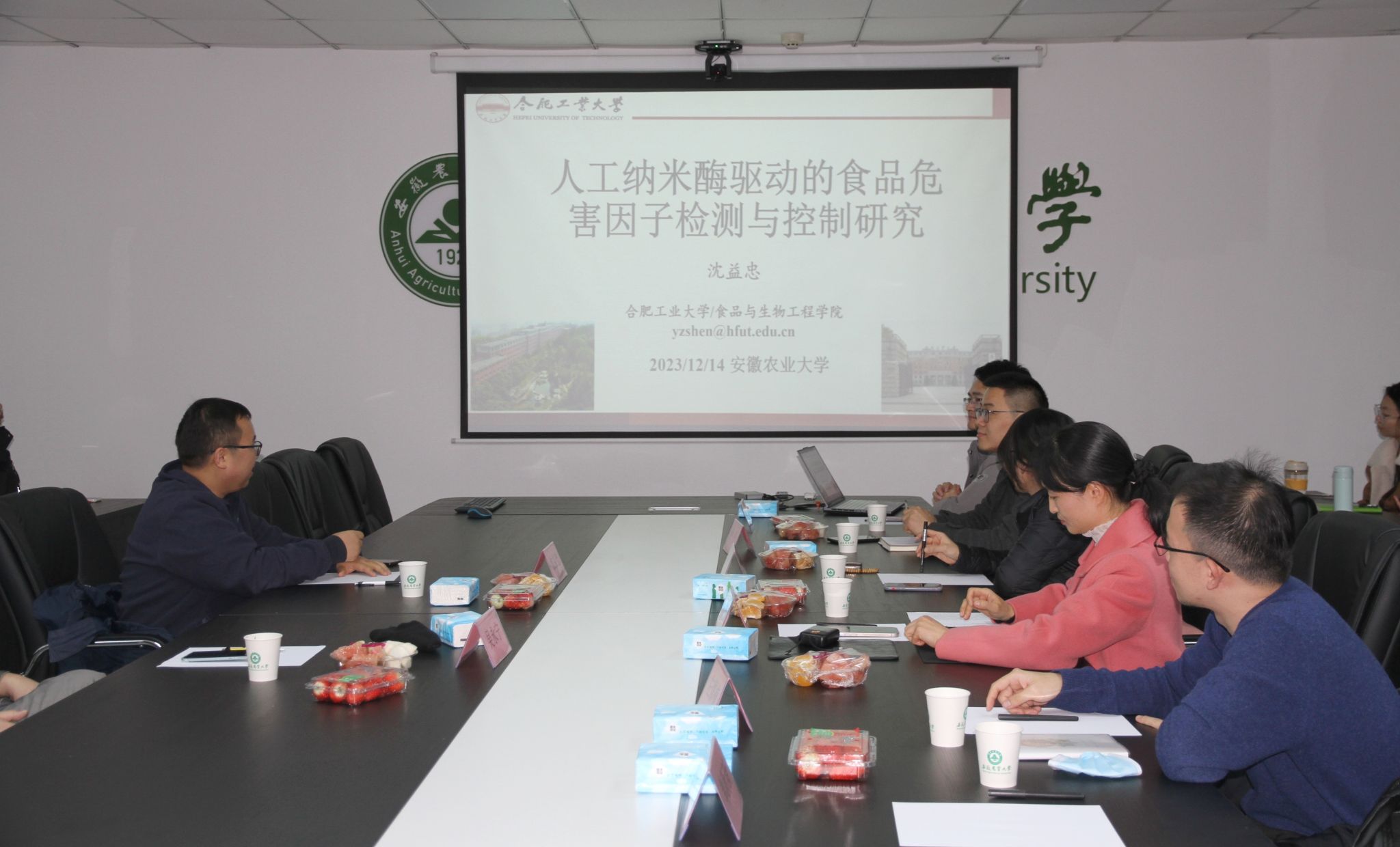 本网讯 2023年12月14日下午,动物科技学院动物性食品安全创新团队邀请合肥工业大学食品与生物工程学院沈益忠副研究员在生物科技楼B107会议室为学院师生做了题为“人工纳米酶驱动的食品危害因子检测与控制研究”的学术报告。报告会由学院李琳教授主持,教师和学生代表出席现场报告会。