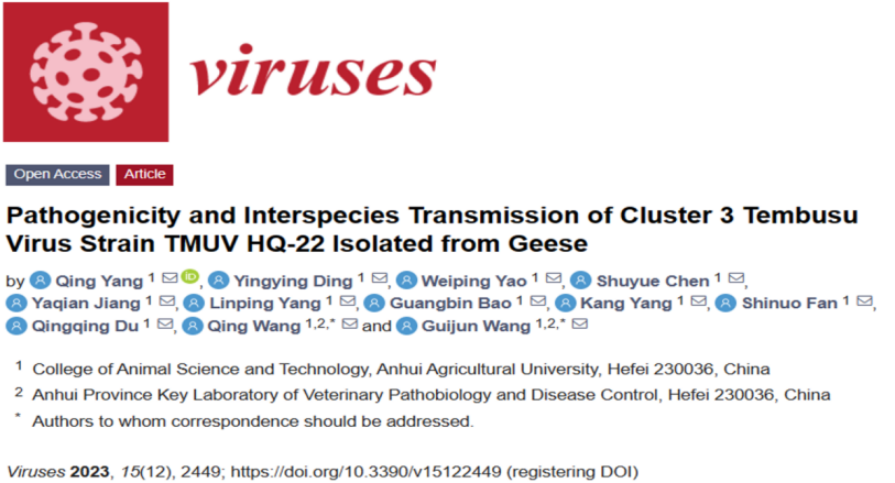 我校2021级预防兽医学研究生杨庆为该论文第一作者,王桂军教授和王晴副教授为通讯作者,安徽农业大学为第一通讯单位。该项研究得到国家自然科学基金、安徽省高效协同创新等项目资助。(原文链接:https://www.mdpi.com/1999-4915/15/12/2449)(作者:王晴 杨庆 一审:杜亚娜 二审:凌英会 三审:张子军)