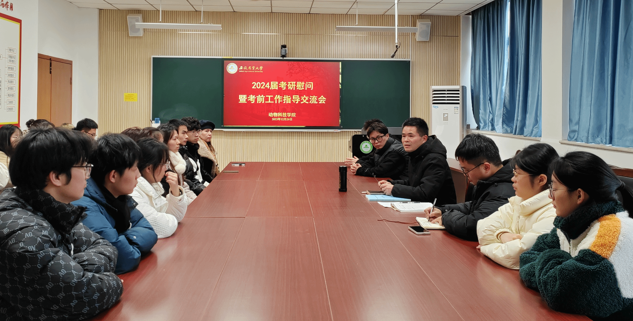 本网讯 2024年硕士研究生考试已进入倒计时阶段,为进一步减轻学生的备考压力,增强考试信心,12月20日下午,动物科技学院开展2024届考研慰问暨考前工作指导交流会。2024届考研学生代表、毕业班辅导员共同参加。交流会由学院党委副书记章巍主持。