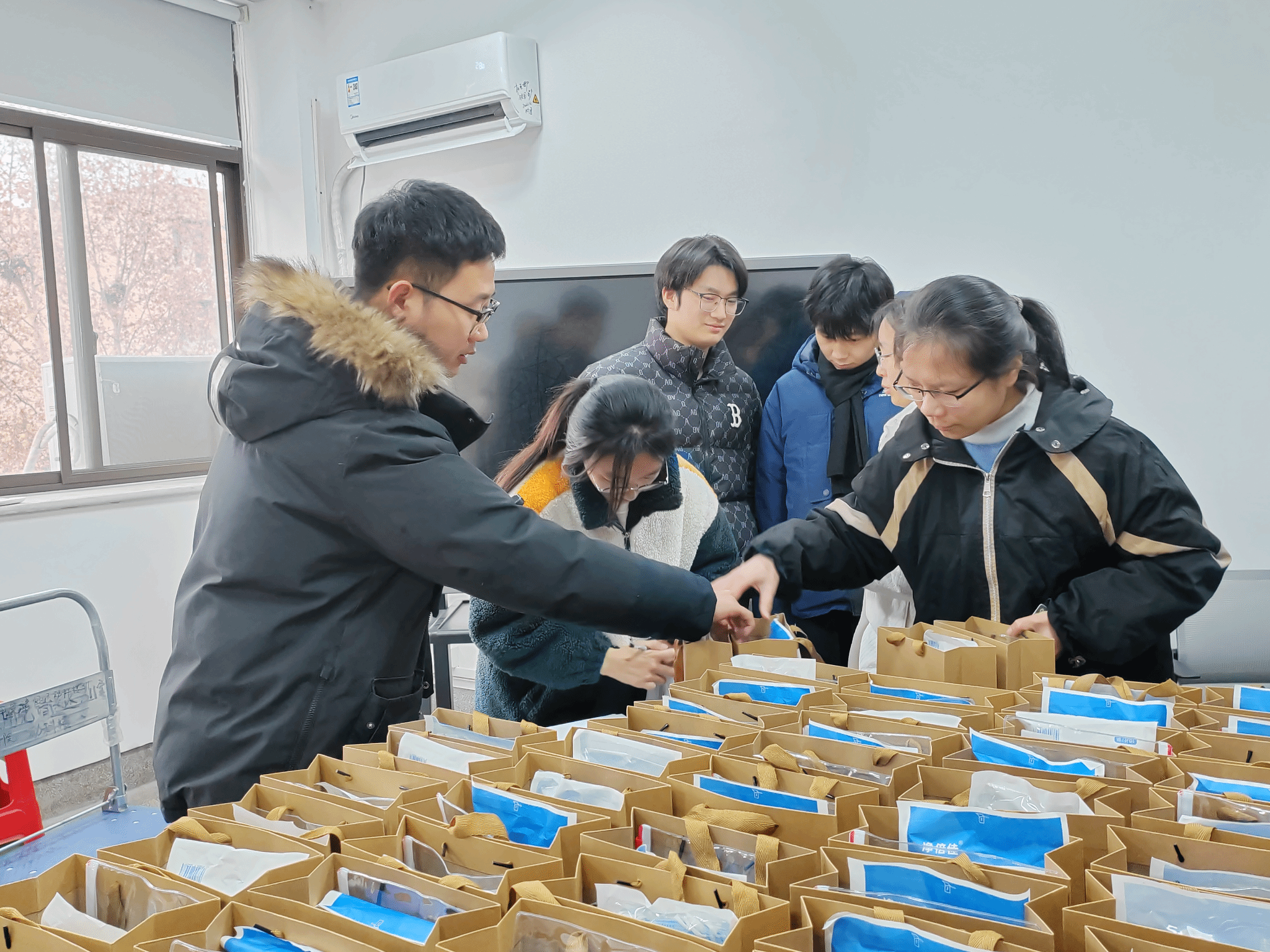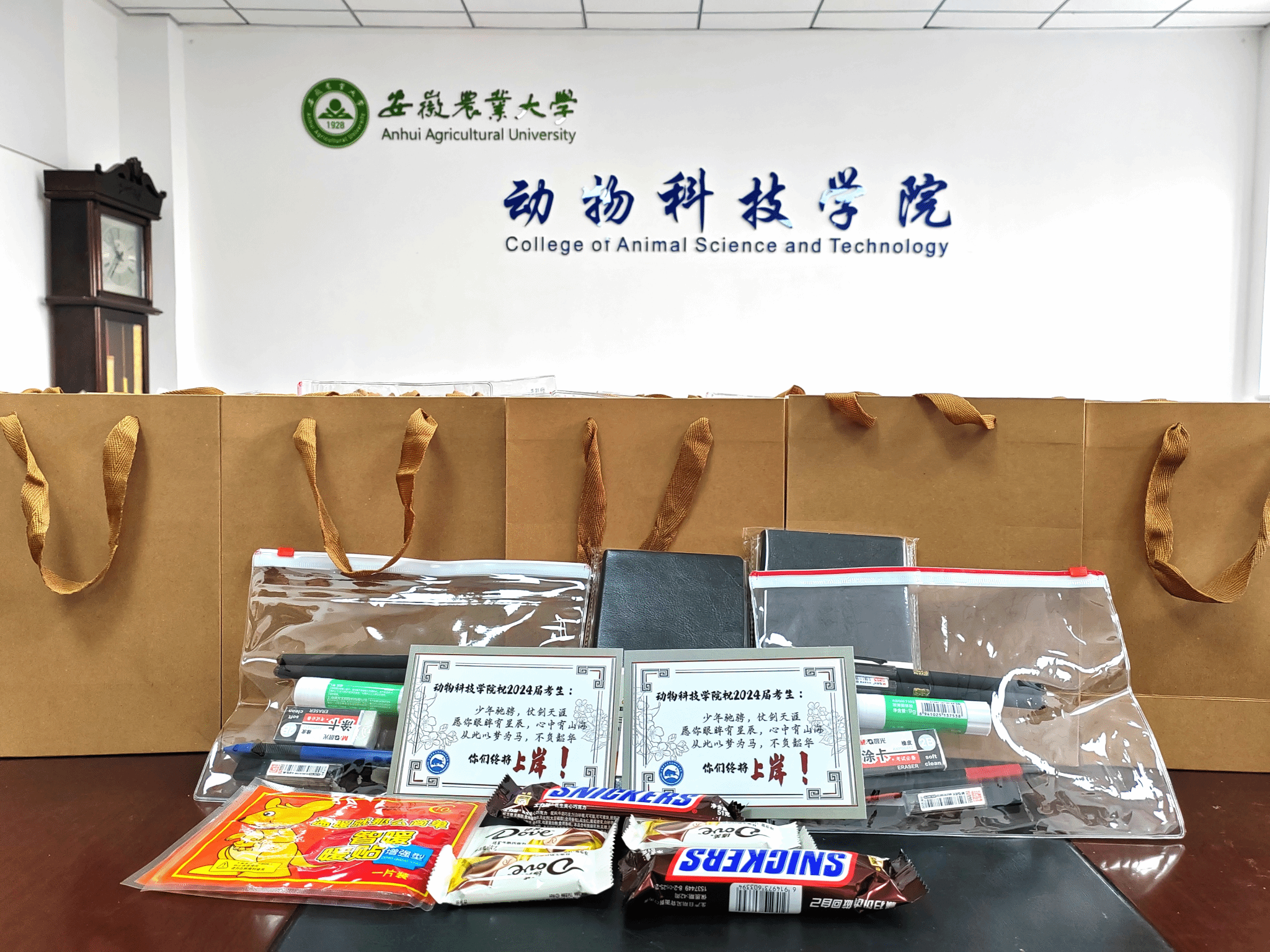 本次活动还安排了考研慰问环节。学院为每一位考研学子准备了考研礼包,轻巧实用的文具套装、补充能量的巧克力、心意满满的祝福卡片,承载着学院对考研学生的关心与关怀。会前,学生党员热心服务,分装考研礼包;会后毕业班辅导员老师耐心梳理,分发考研礼包,并送出美好祝福,鼓励同学们以满满的信心和动力迎接考试。