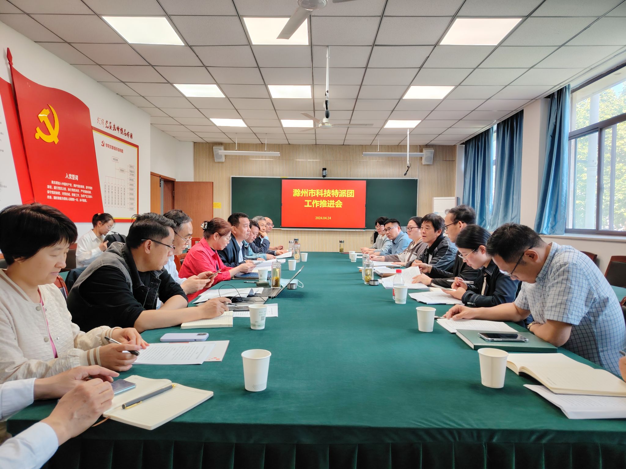本网讯 根据安徽省科技厅“关于组织开展首批省级科技特派团项目全面自查及整改的通知”要求, 4月24日上午,滁州市科技特派团工作自查会议在安徽农业大学动物科技学院召开。滁州市科技局四级调研员侯智,安徽省科技成果转化促进中心顾勇,定远县科技局副局长司武斌,明光市科技局副局长胡宏娟,安徽农业大学动物科技学院院长、定远县江淮分水岭农牧耦合生态农业科技特派团团长张子军,滁菊产业科技特派团团长、我校教授李梅青,明光市艾草及绿色食品产业科技特派团团长、我校副教授陈友根,科技特派团成员等20余人参加会议。