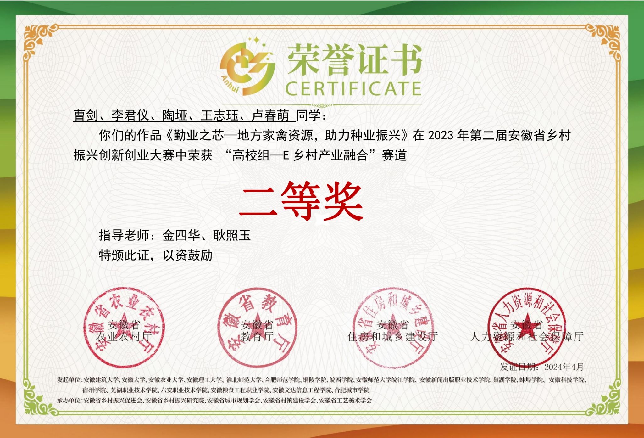 本网讯 近日,第二届安徽省乡村振兴创新创业大赛落下帷幕,由我院金四华、耿照玉作为指导老师,曹剑、李君仪、陶垭、王志珏、卢春萌同学参赛的项目《勤业之芯—地方家禽资源,助力种业振兴》在大赛中斩获二等奖!