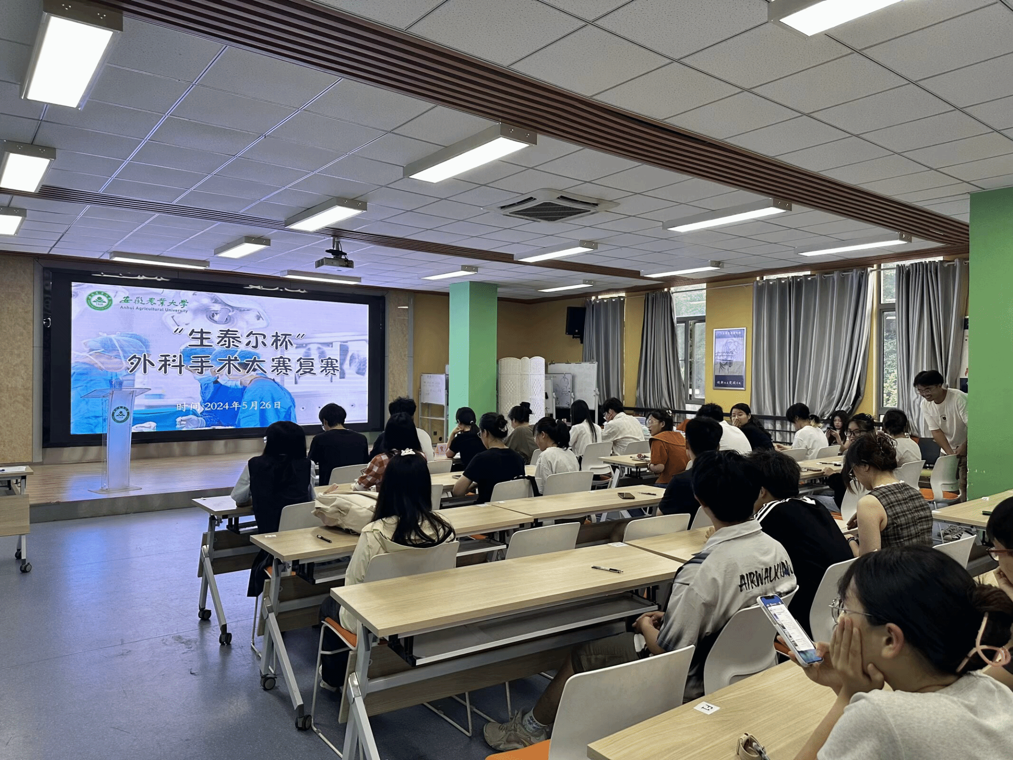 此次外科手术大赛,来自全校42个不同专业的240余位选手参加理论知识初赛,初赛于5月7日在勤学楼举办,采取线下试卷答题的形式。根据初赛结果,28名选手入围复赛。复赛前,由动物科技学院教师张涛对参赛人员进行赛前培训。