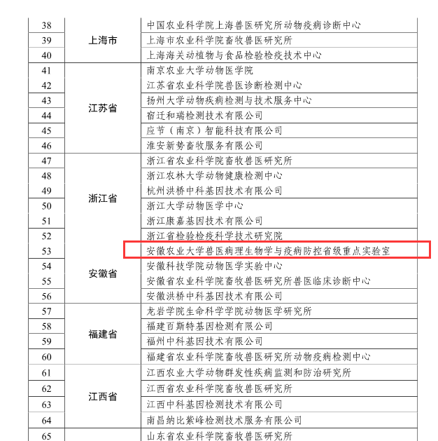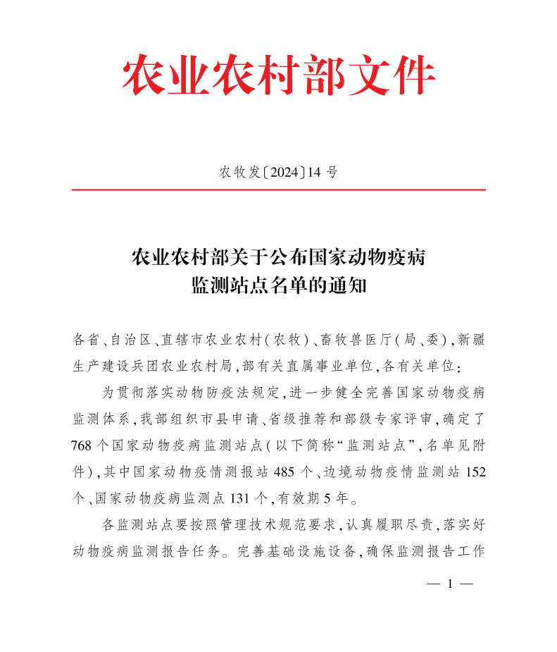 本网讯 近日,农业农村部印发《农业农村部关于公布国家动物疫病监测站点名单的通知》(农牧发 [2024] 14号),我校兽医病理生物学与疫病防控安徽省重点实验室获批“国家动物疫病监测点”。