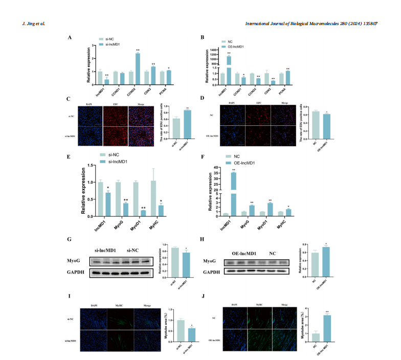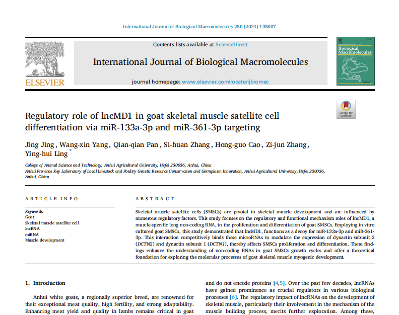 本网讯 近日,我校动物科技学院凌英会教授团队在生物学知名期刊《International Journal of Biological Macromolecules》(IF=7.7,中科院一区,Top期刊)上发表了题为“Regulatory role of lncMD1 in goat skeletal muscle satellite cell differentiation via miR-133a-3p and miR-361-3p targeting”的研究性论文。该论文研究了lncMD1在肌肉发育过程中调控作用,揭示了其调控山羊骨骼肌卫星细胞生长过程中的分子机制,为探索山羊骨骼肌发育的分子过程提供了理论基础。