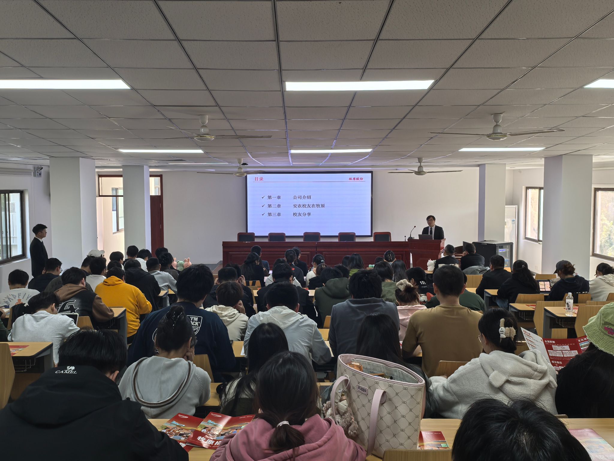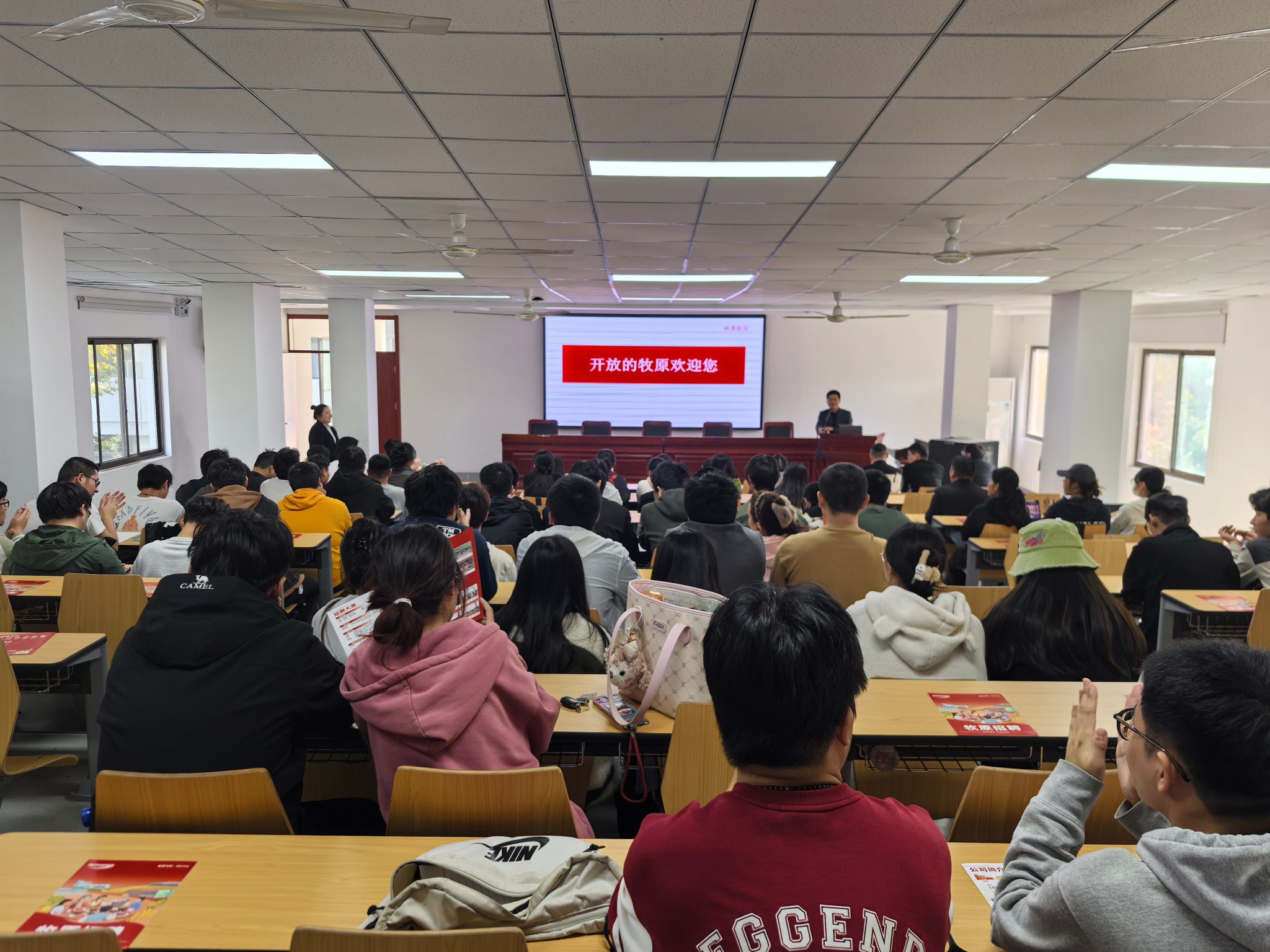 本网讯 11月2日,学院在动科楼318教室举办牧原集团宣讲会暨优秀校友报告会。学院党委副书记章巍,学院2020届校友牧原集团安徽区域兽医总监袁献宇、2025届毕业生100余人参加此次活动。