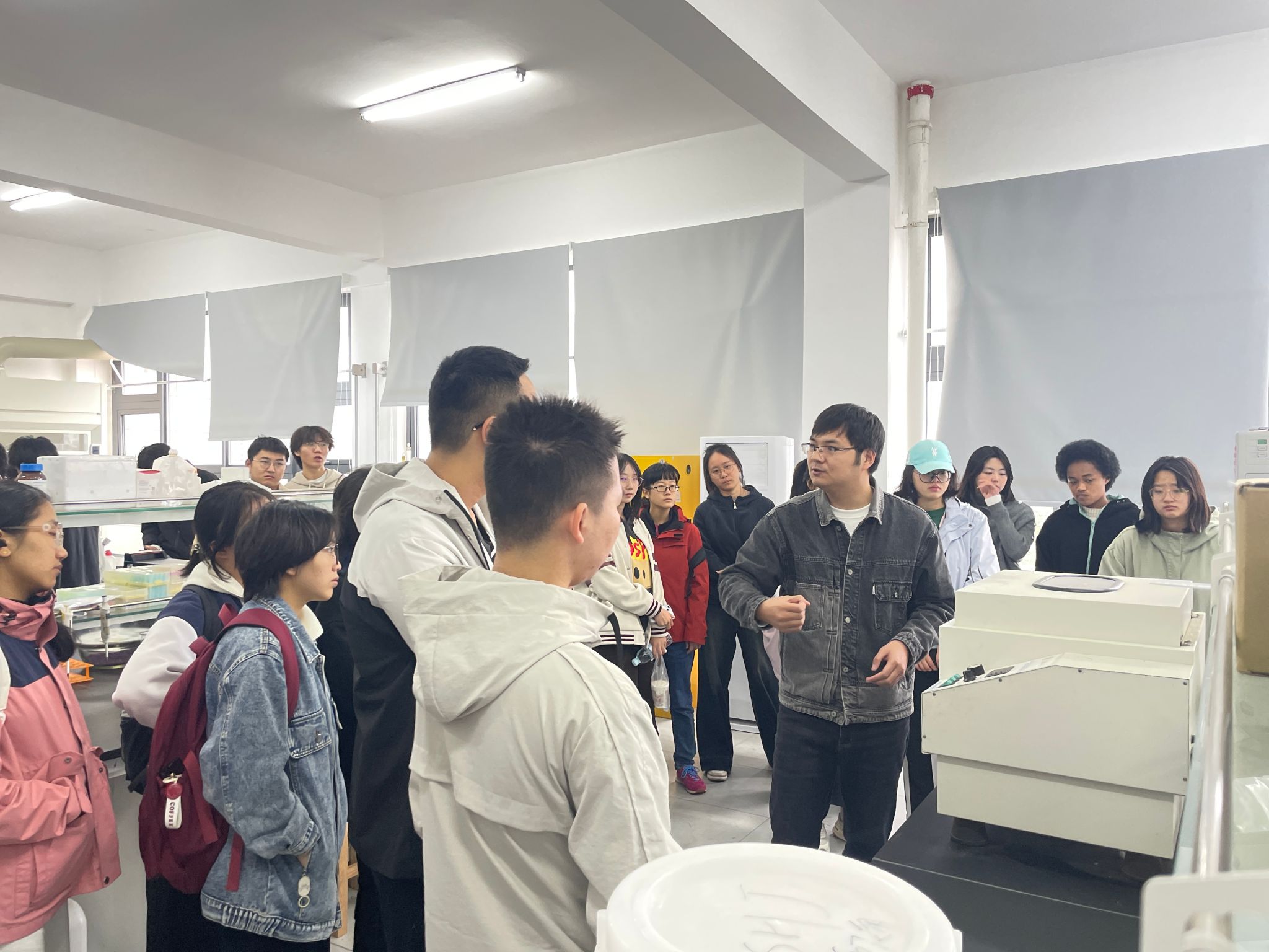 参观伊始,王强军简要介绍了中部地区畜禽遗传资源基因库的建设和使用情况,使学生们对基因库整体情况有了初步印象。接下来,张思欢、于海亮分别介绍了基因库各楼层的具体功能、相关科研团队和实验室,并带学生们逐一了解实验器材、原理以及操作流程。