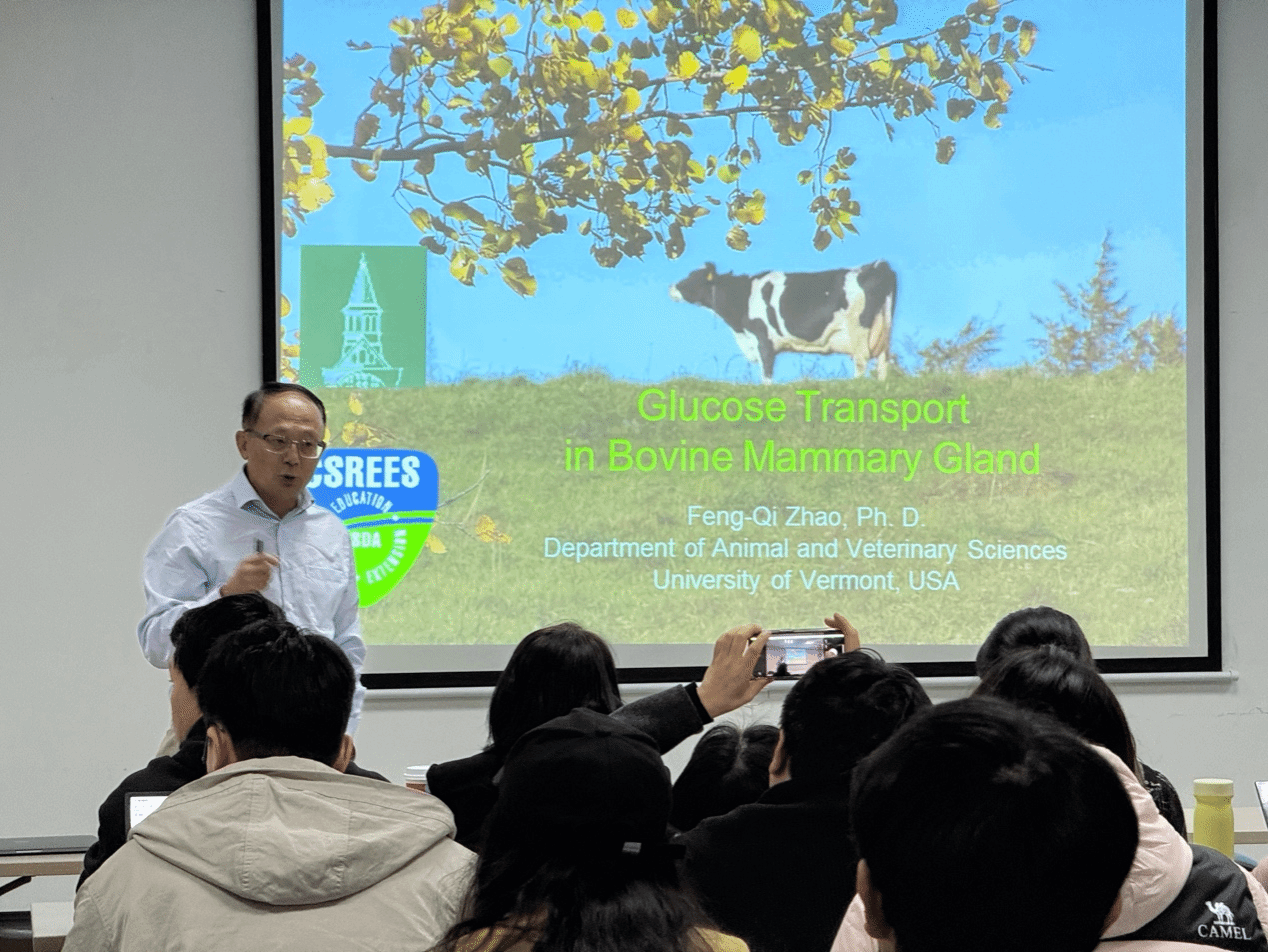 会上,张成首先介绍了赵凤启教授和刘红云教授的个人履历和科研成果,并对两位教授的到来表示热烈欢迎。随后,赵凤启教授作题为《Glucose transport in bovine mammary gland》的报告,详细介绍了奶牛乳腺内葡萄糖的摄取、转运和代谢调控等方面的研究进展,提出葡萄糖转运体(GLUT)对乳腺发育的意义、对乳腺炎的影响及与育种相关的GLUT SNPs筛选,为在场师生提供了关于奶牛乳腺健康和产奶性能提升的新视角。