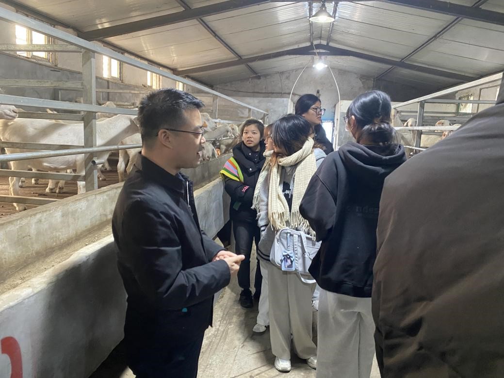 第二天,在临泉养殖场进行参观。在中原牧场第四养殖小区,牧场总经理张学伟介绍养殖的各种纯种牛,带领学生认识不同牛的品种特征,生产特性及杂交利用方向等,也介绍了刚参加完德国汉诺威国际畜牧展的一些体会,希望学生们努力学习专业知识,为我国畜牧业作出贡献,并赠送牛种的海报和明信片。在临泉天缘牧业,遇到正在带领研究生开展基因编辑羊胚胎移植工作的研究生。教师李运生给同学们讲解基因编辑相关科研工作的内容,并带同学们参观肌肉生长抑制素(MSTN)基因编辑羊。在临泉恒丰牧业,刘洪瑜带学生们近距离参观皖临白山羊,通过实地参观学习,使同学们对品种培育过程中导入品种的选择、品种培育的长期性等有了更加深刻的认识。