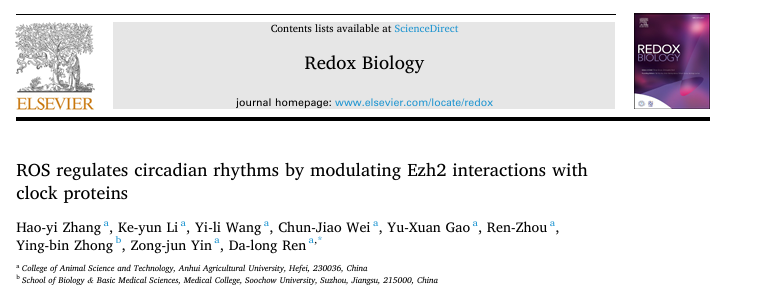 本网讯 近日,学院任大龙、殷宗俊教授课题组在生物学领域权威期刊《Redox Biology》(影响因子11.4,中科院一区TOP期刊)发表题为“ROS regulates circadian rhythms by modulating Ezh2 interactions with clock proteins”的研究论文。该研究首次揭示了氧化应激通过修饰EZH2和钟蛋白相互作用调控生物节律的新机制,为相关疾病的干预治疗提供了重要理论依据。
