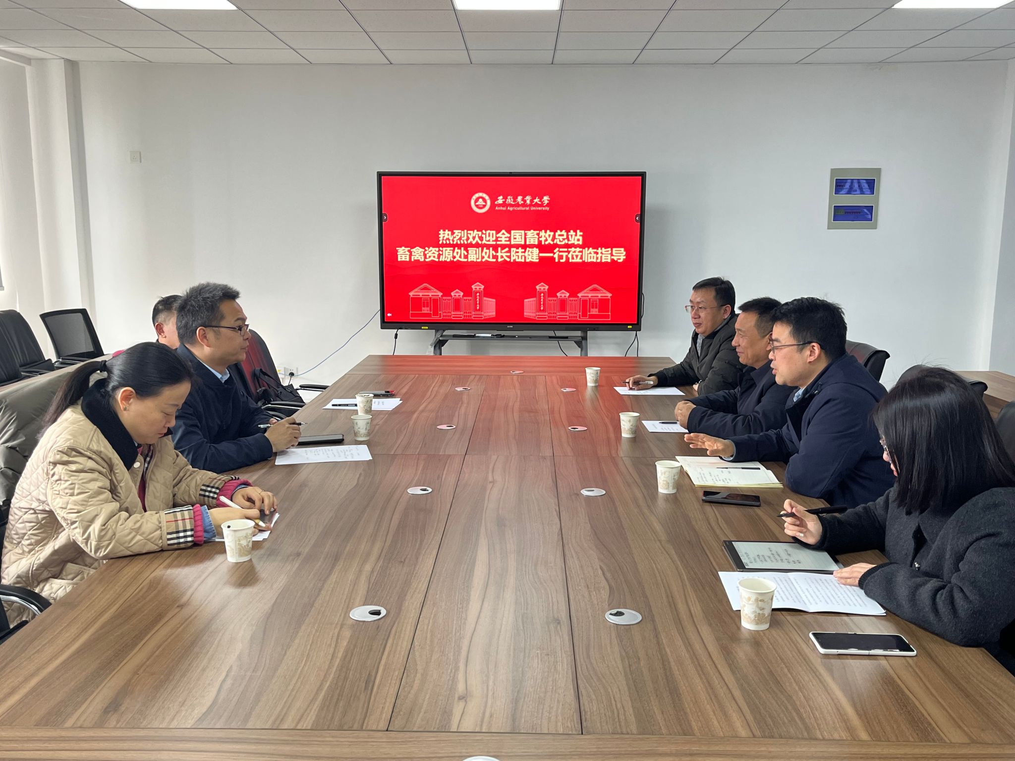 本网讯 2月19日,全国畜牧总站畜禽资源处副处长陆健一行到动物科技学院开展座谈交流。安徽省畜禽遗传资源保护中心主任占松鹤,综合办公室主任涂小璐,校科技处副处长凌英会,动物科技学院院长张子军,副院长曹祖兵、袁小琛参加了座谈会。