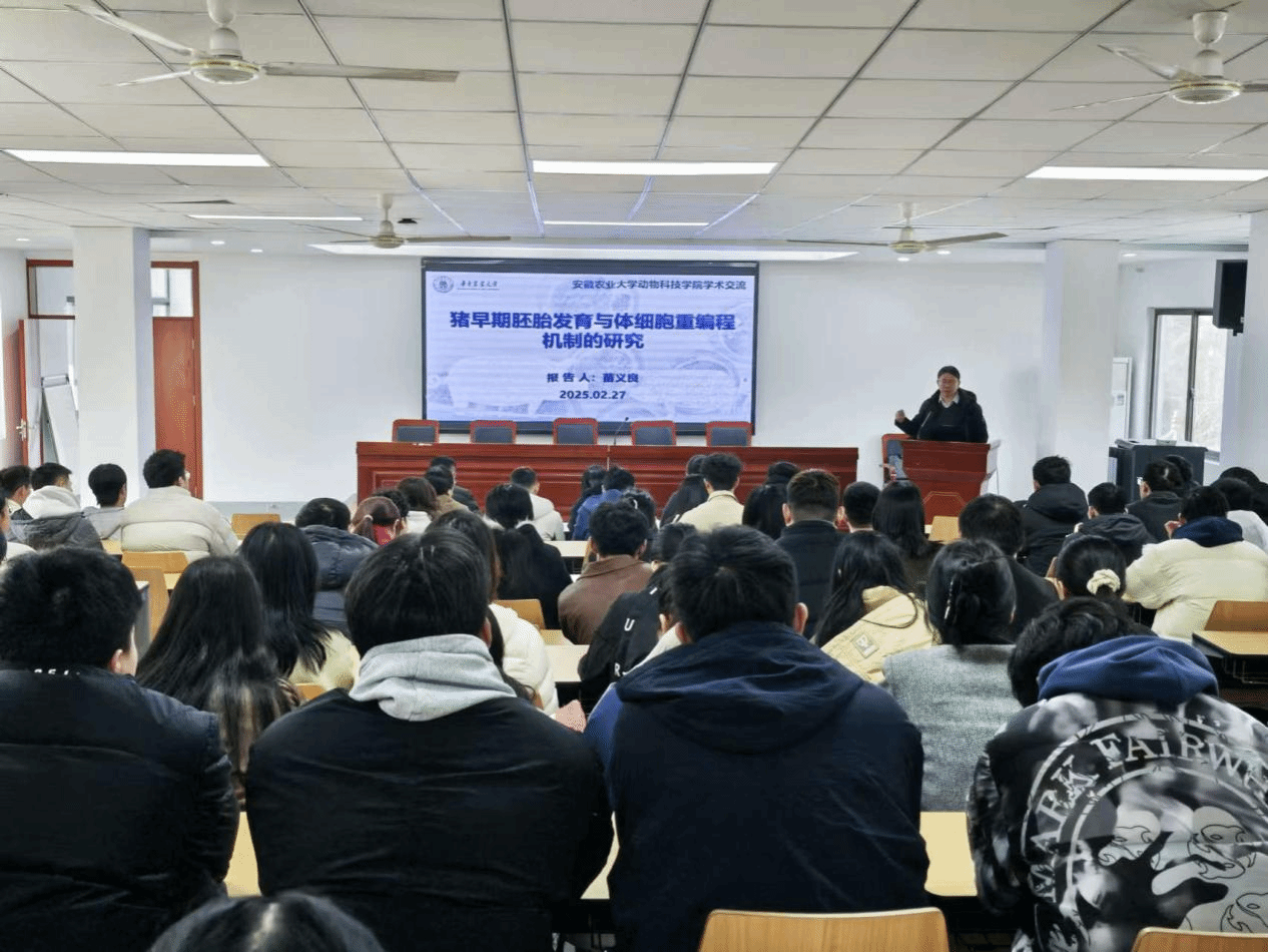 2月27日,苗义良教授作题为“猪早期胚胎发育与体细胞重编程机制的研究”的报告。苗老师重点讲解组蛋白修饰调控早期胚胎发育机制、早期胚胎发育过程中染色质开放性规律、转录因子在早期胚胎发育中的作用机制等方面研究成果,发现利用微量胚胎染色质分析技术系统绘制了猪早期胚胎发育中组蛋白修饰动态模式,阐明猪早期胚胎发育中染色质开放性规律,并进一步揭示转录因子KLF4调控猪早期胚胎发育中染色质重塑的机制。图文并茂的展示和深入浅出的讲解,向与会者介绍早期胚胎发育领域的前沿创新性成果。会后师生与苗老师就相关科学问题进行热烈交流。
