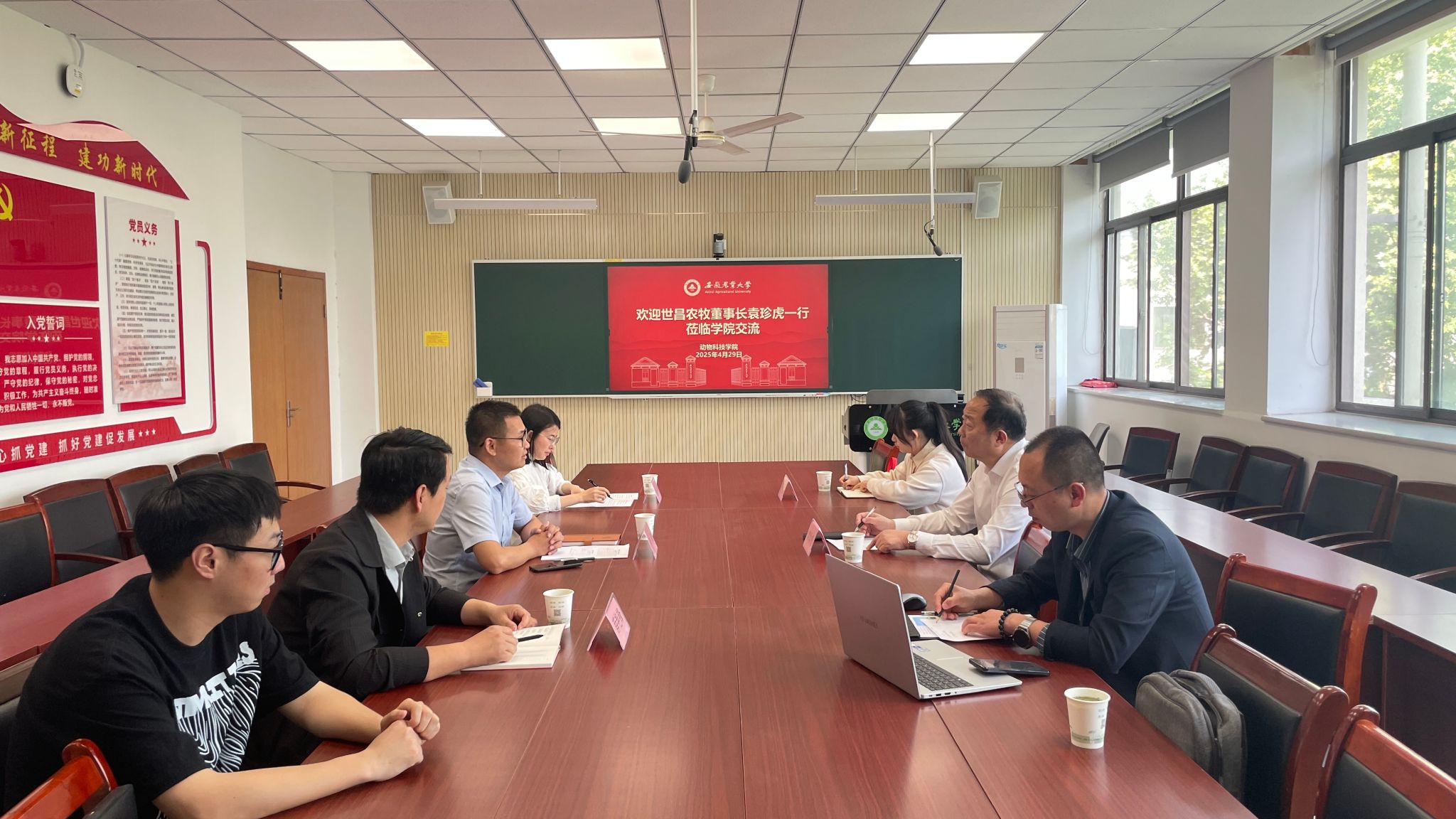 本网讯 4月29日上午,江苏世昌农牧集团股份有限公司董事长袁珍虎、人事经理陈士贵、人事主管严艺一行来我院座谈交流,学院副院长袁小琛、动物营养与饲料科学系副主任薛艳锋等参加座谈会,会议由学院党委副书记卢伟主持。