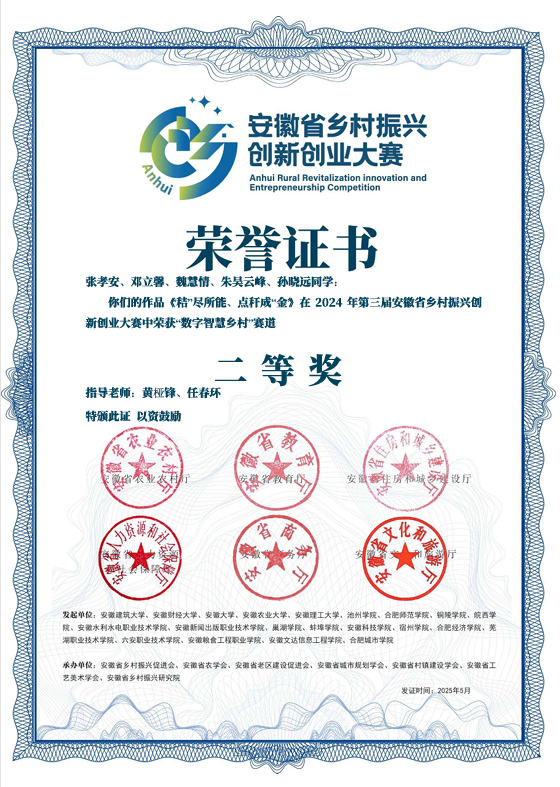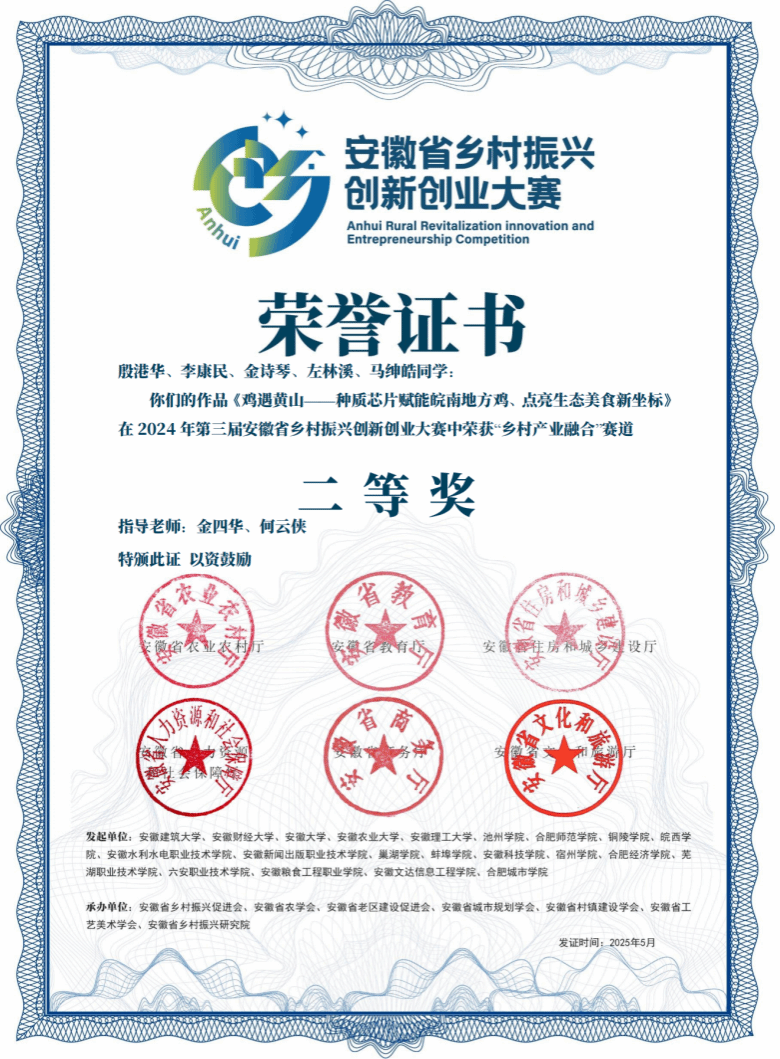 本网讯 近日,由省农业农村厅、省教育厅、省住房和城乡建设厅、省人力资源社会保障厅、省商务厅、省文化和旅游厅共同举办的第三届安徽省乡村振兴创新创业大赛落下帷幕,由我院教师金四华、何云侠指导的“鸡遇黄山”项目,以及黄桠锋、任春环指导的“‘秸’尽所能,点秆成‘金’”项目获得二等奖。