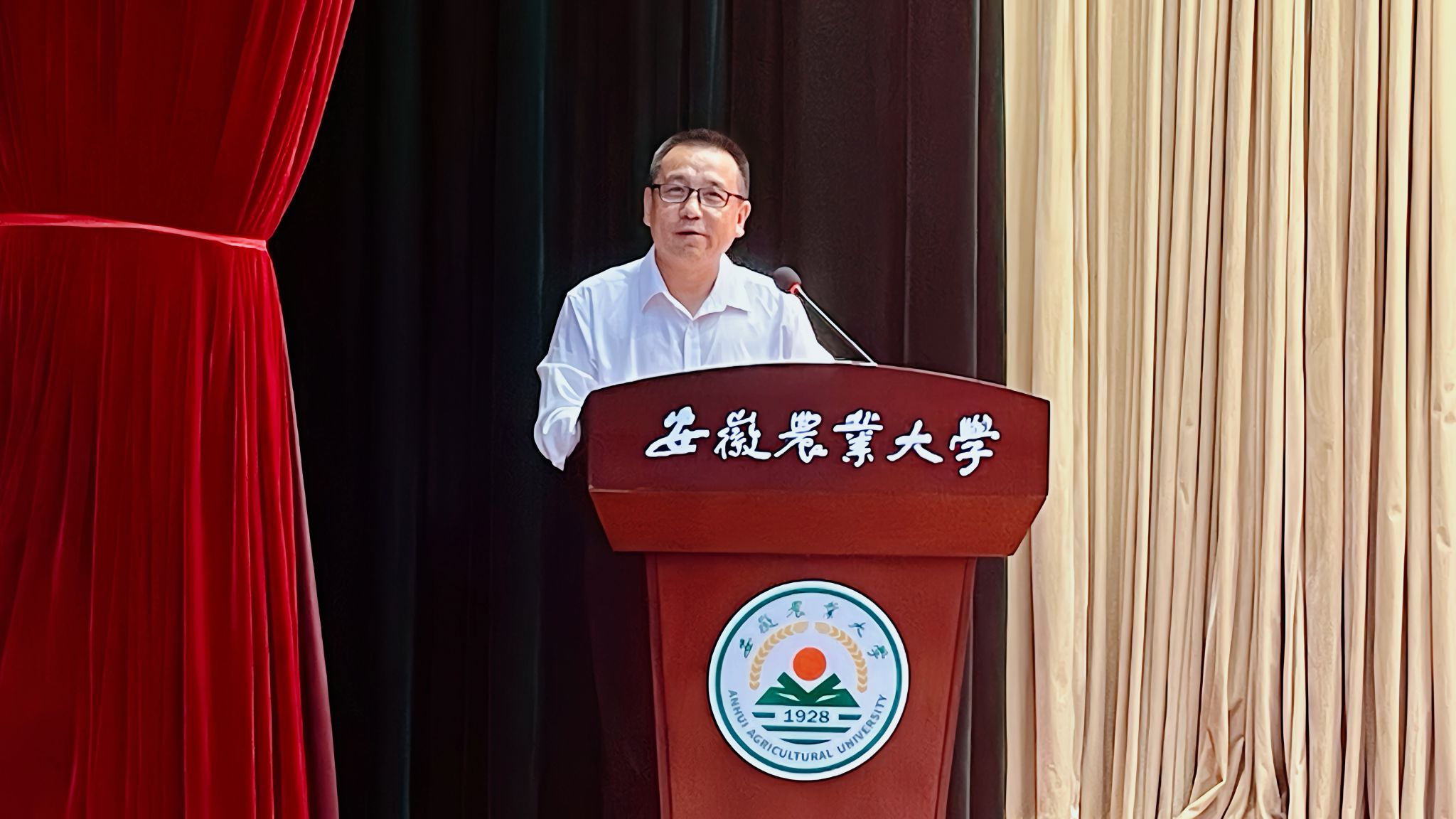 教师代表张运海以《赓续安农“三牛”精神,争做强农先锋社会英才》为题,分享自身经历与感悟,鼓励新生脚踏实地、关注产业、心怀热爱、勇于突破,传承安农精神,早日成为知农爱农、强农兴农的先锋力量。