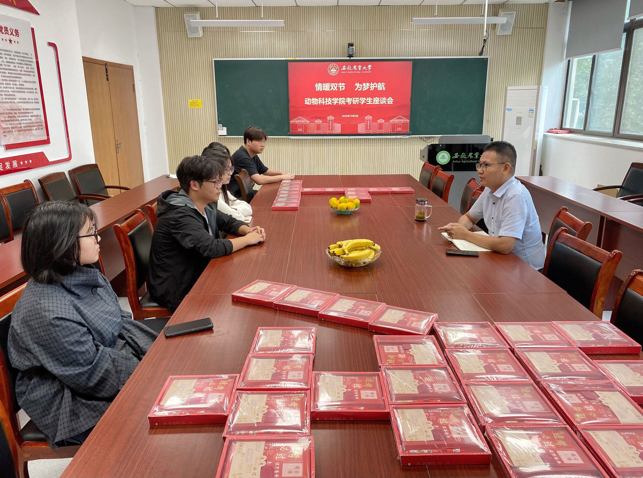 本网讯 为关怀因备考而留校的考研学子,动物科技学院于10月3日举办“情暖双节,为梦护航”主题座谈会,为正在紧张备考的同学们送去学院的温暖与力量,座谈会由学院党委副书记卢伟主持。