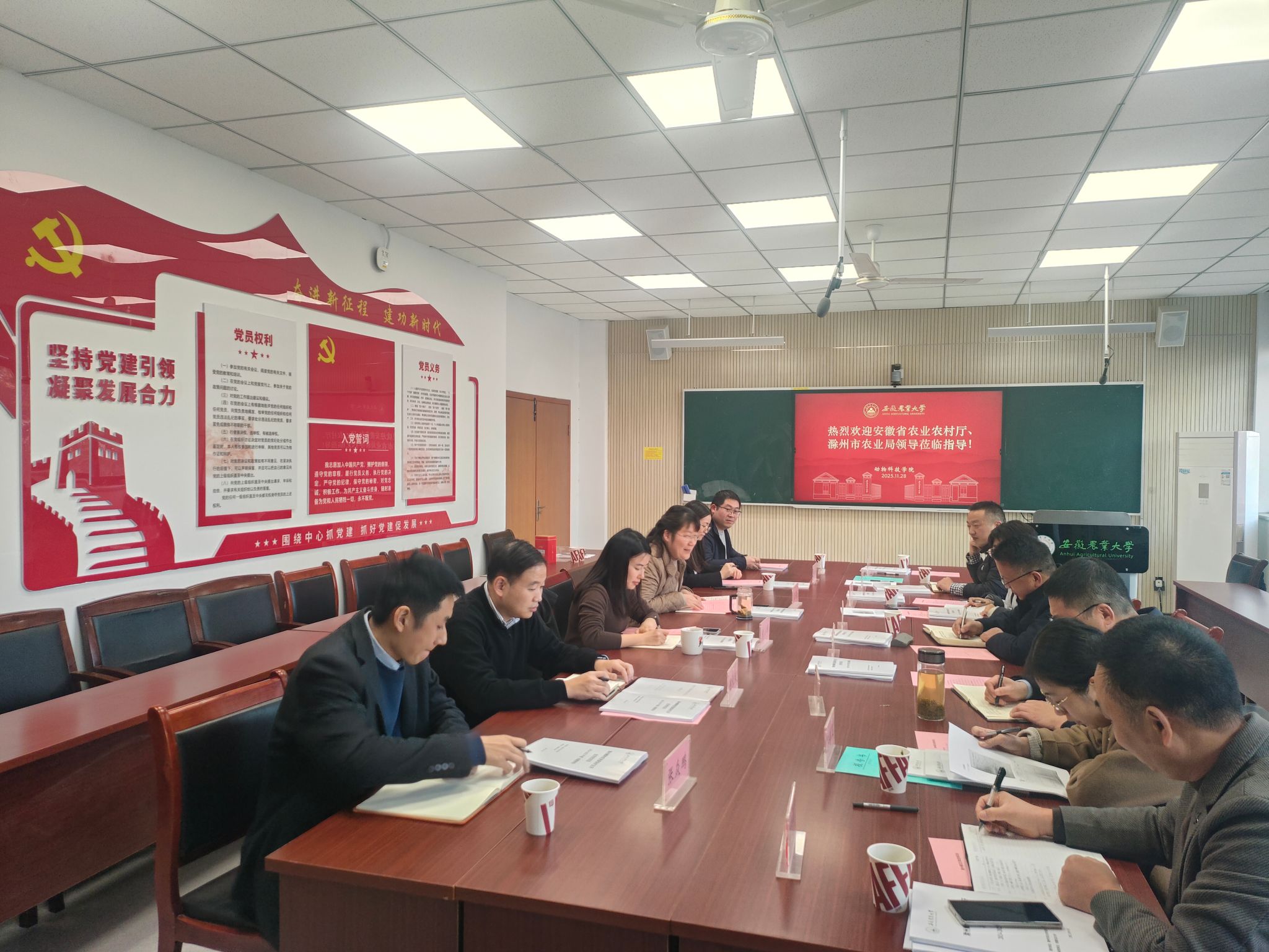 本网讯 11月28日,安徽省农业农村厅渔业渔政管理局副局长赵蕾、滁州市农业农村局局长程军才、副局长李宝松等一行莅临我校,就滁州鲫相关项目召开专题推进座谈会。动物科技学院党委书记沈兆梅、副院长袁小琛、水产系相关教师参加本次会议。