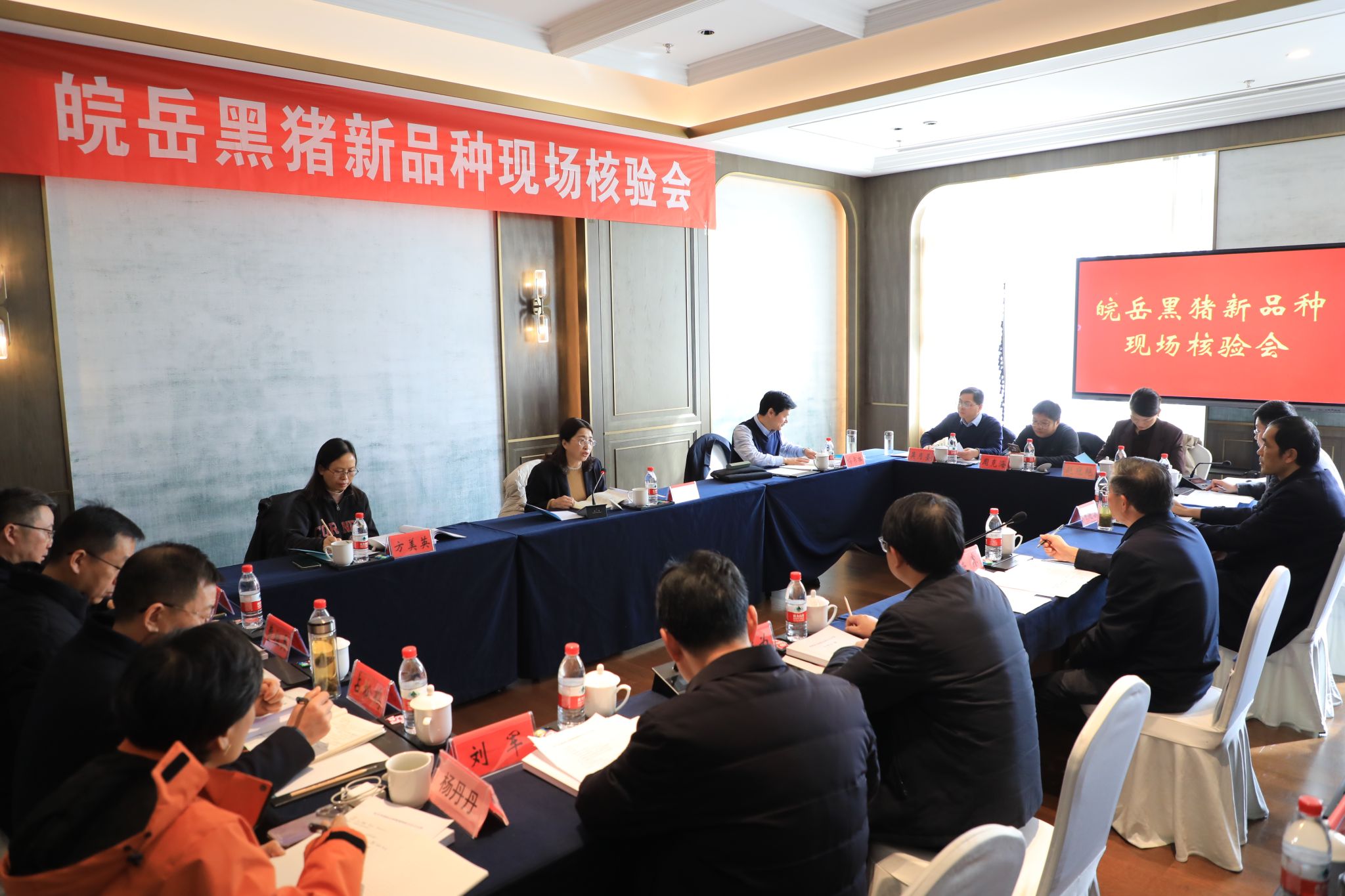 皖岳黑猪新品种是由我校与安徽徽名山农业股份有限公司联合牵头,汇聚多方力量,历时十五年系统选育而成的安徽省首个优质黑猪新品种。该品种实现了繁殖力高、肉质优、生长较快的多重性状平衡,经产母猪产仔数达13头以上,肌内脂肪含量3.93%,综合性能突出。专家组于12月12日深入育种场进行现场测定,13上午召开评审会议,听取育种工作汇报、查验档案资料,经过质询交流,对皖岳黑猪育种取得的成效给予充分肯定。