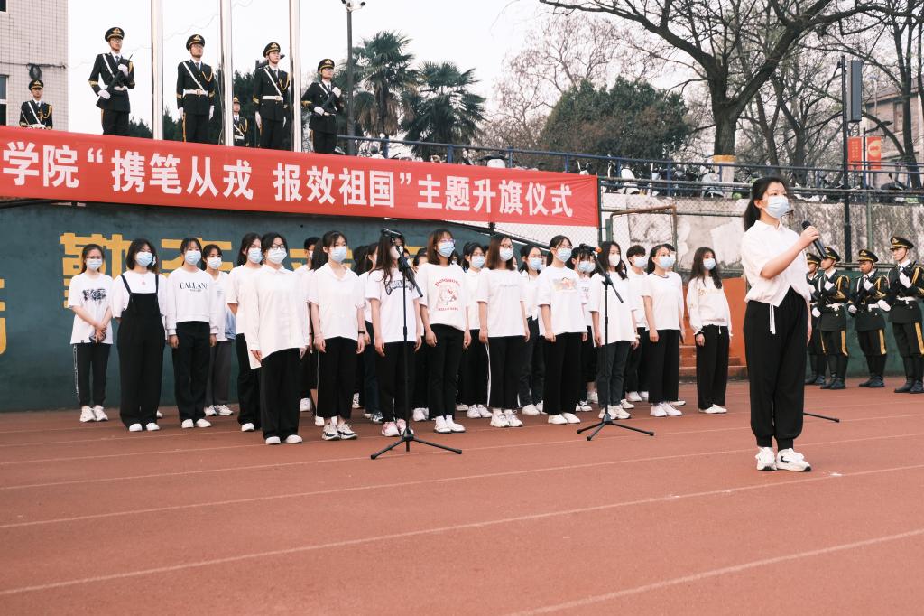 礼毕,2021级学生代表合唱歌曲《走进新时代》,用歌声传递力量,感召更多动科学子传承红色基因、汲取奋进力量,以崭新面貌迎接学习、生活和工作。接着,在庄严的国旗下,学院退伍复学学生代表2020级动物医学专业郭旭阳同学,围绕“军旅生活”进行主题分享。“我马三秋暖,抵御一世寒”,两年的军旅生活不仅拓宽了视野,也增长了见识。从“携笔从戎”到“报效祖国”,郭旭阳同学一直在路上,也将激励更多同学努力拼搏,积极投身爱国报国队伍中。