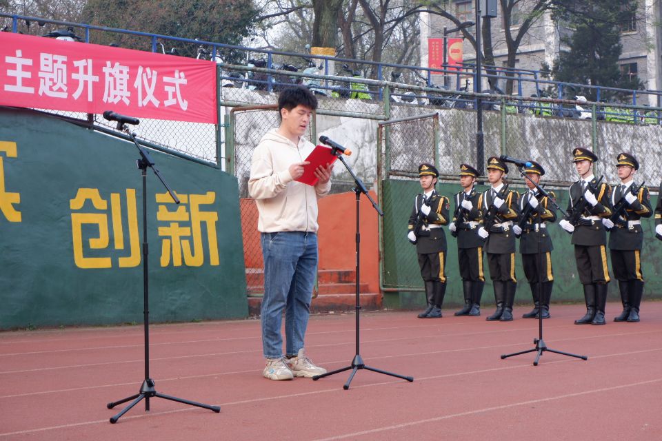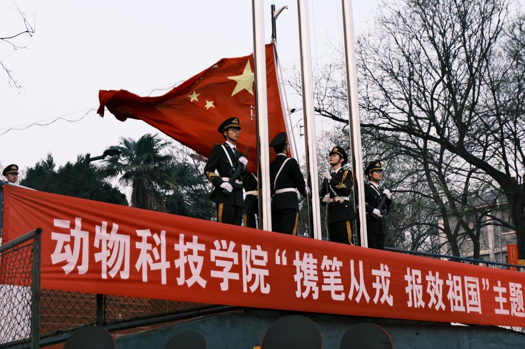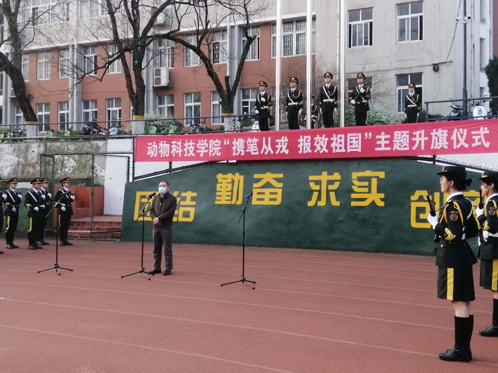 本网讯:为深入学习习近平总书记“七一”重要讲话精神,贯彻落实《中华人民共和国国旗法》,3月14日早上7点,动物科技学院在校第一运动场举行“携笔从戎 报效祖国”主题升旗仪式。党委学生工作部、武装部、学生处(部)处长姚莉、党委武装部副部长兼学生处副处长刘柳、学院党政领导班子、全体专兼职辅导员班主任、学院全体学生参加了此次升旗仪式。仪式由学院党委副书记章巍主持。