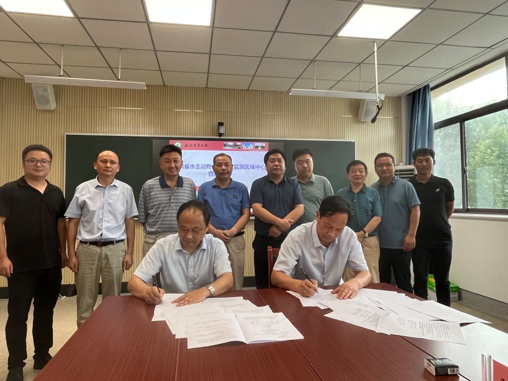 本网讯:8月11日,动物科技学院与合肥市畜牧水产技术推广中心在动科楼306会议室举行安徽省水生动物疫病防控监测区域中心合肥中心共建签约仪式。学院党委书记曹俊、院长耿照玉、合肥市农业农村局副局长易述远、合肥市畜牧水产技术推广中心主任赖年悦出席了签约仪式。合肥市农业农村局、合肥市畜牧水产技术推广中心、学院水产养殖系相关人员参加了签约仪式。
