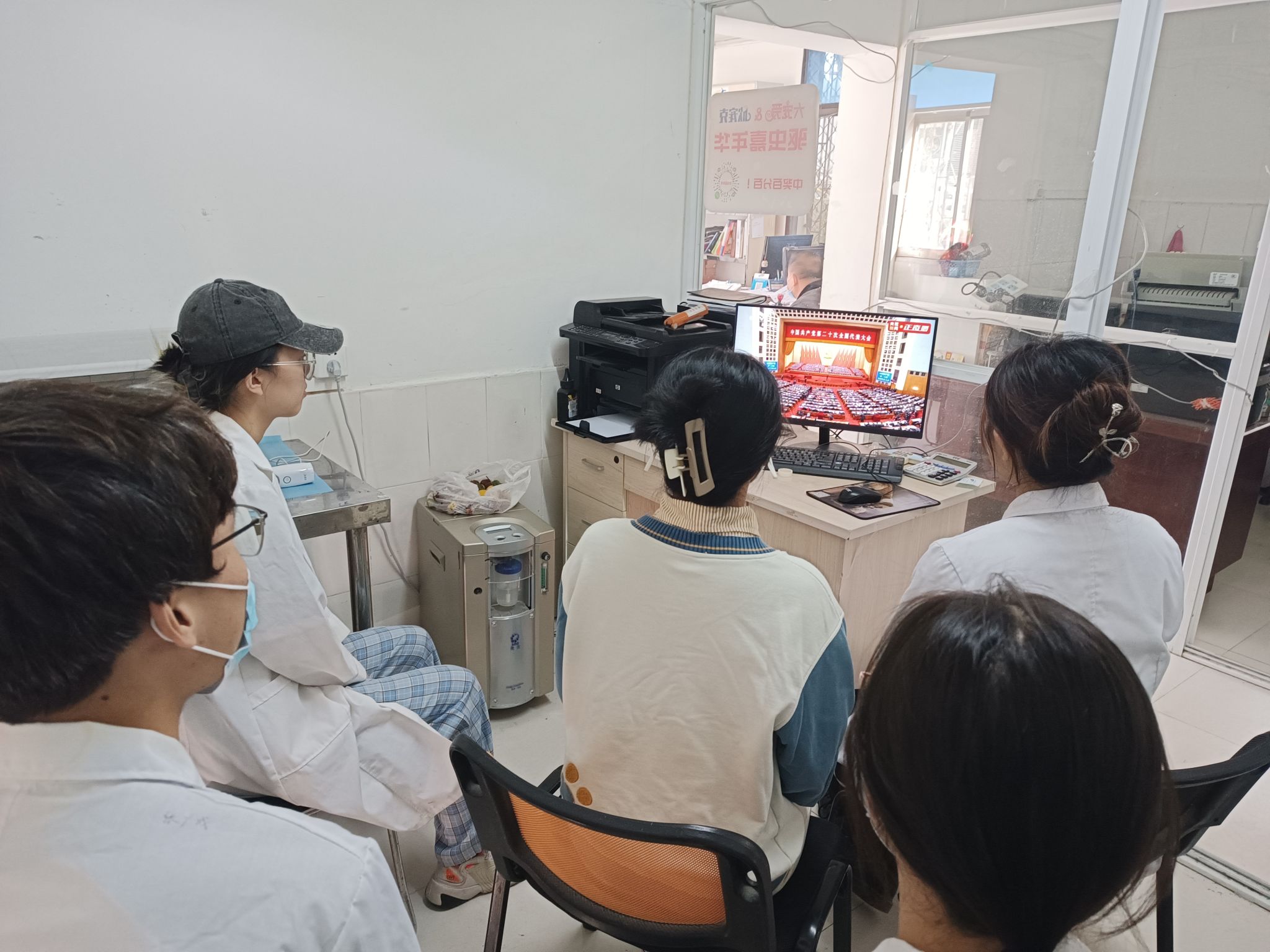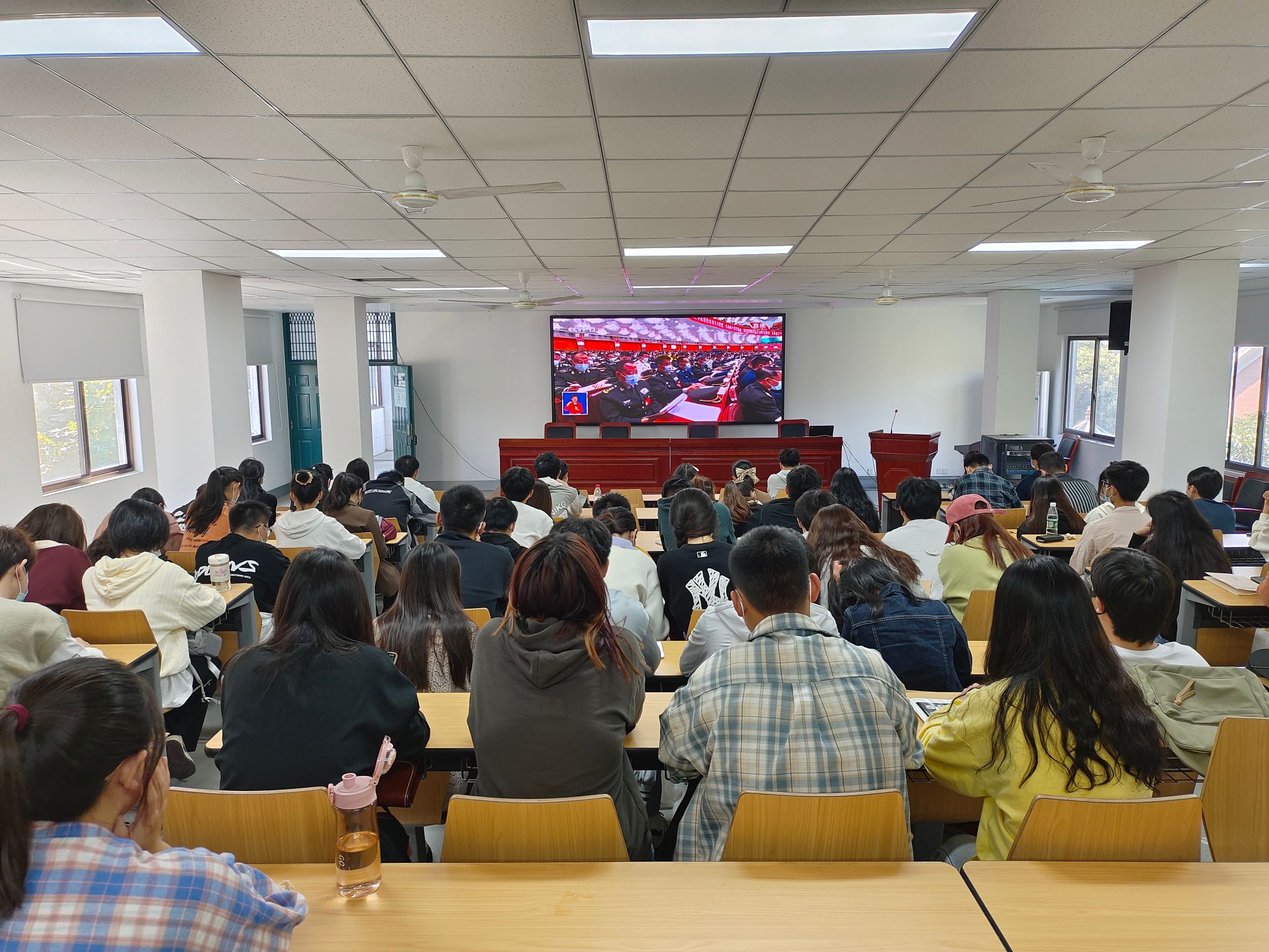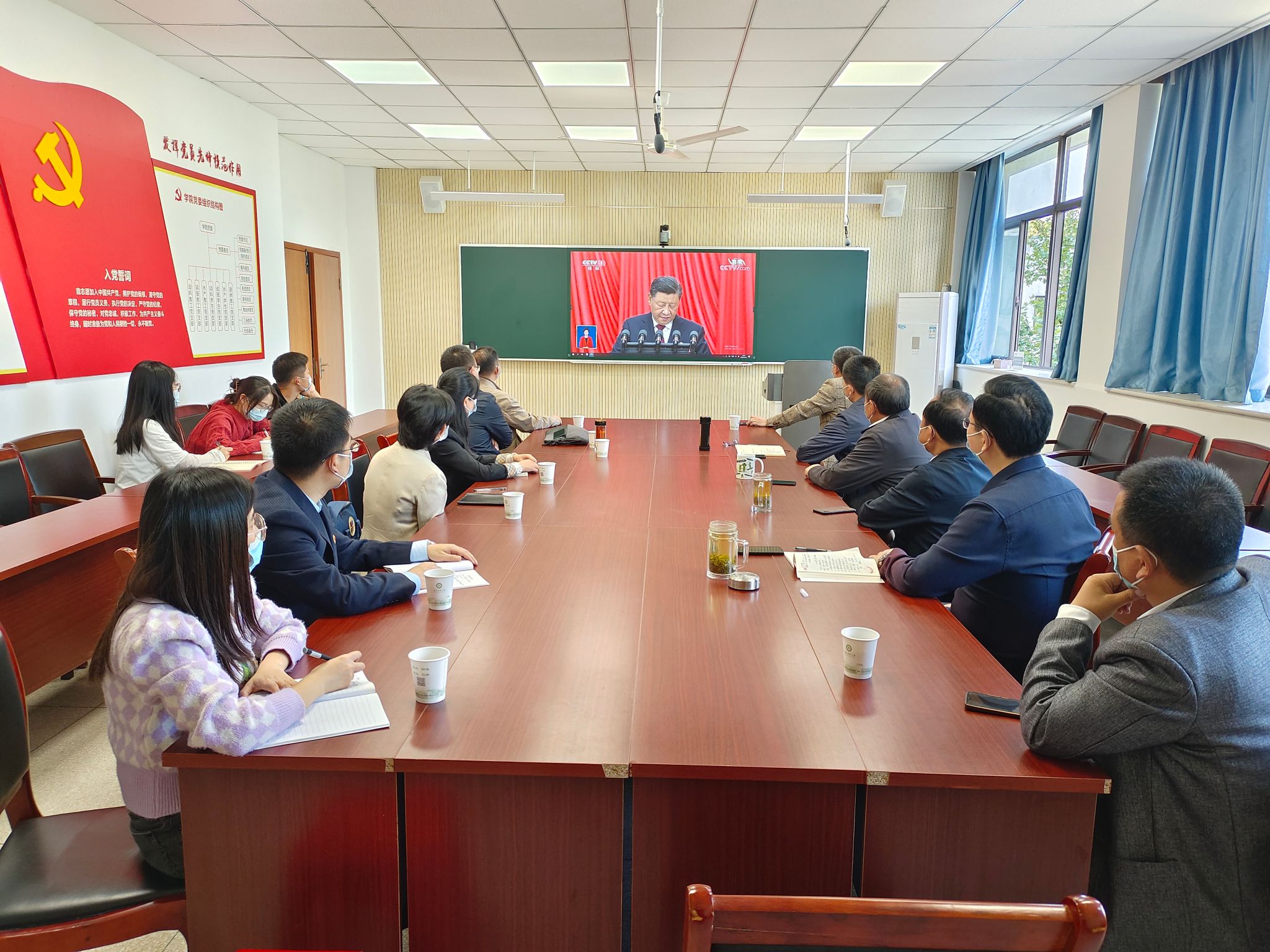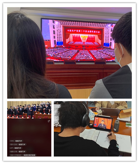 上午10时,学院领导班子、党委委员、纪委委员、教师和学生代表在学院306会议室开展集体学习观看活动;学院团委组织团支部书记、学生骨干在318阶梯教室开展学习观看活动;各党支部、各团支部和学生班级采取多种形式收听收看。