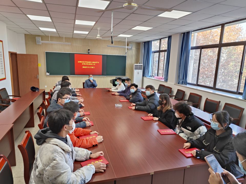 本网讯 11月30日上午,动物科技学院2022年度先进典型表彰大会在学院306会议室举行。学院党委书记曹俊、专职辅导员周德庆、获奖代表孟宇豪等同学参加大会。