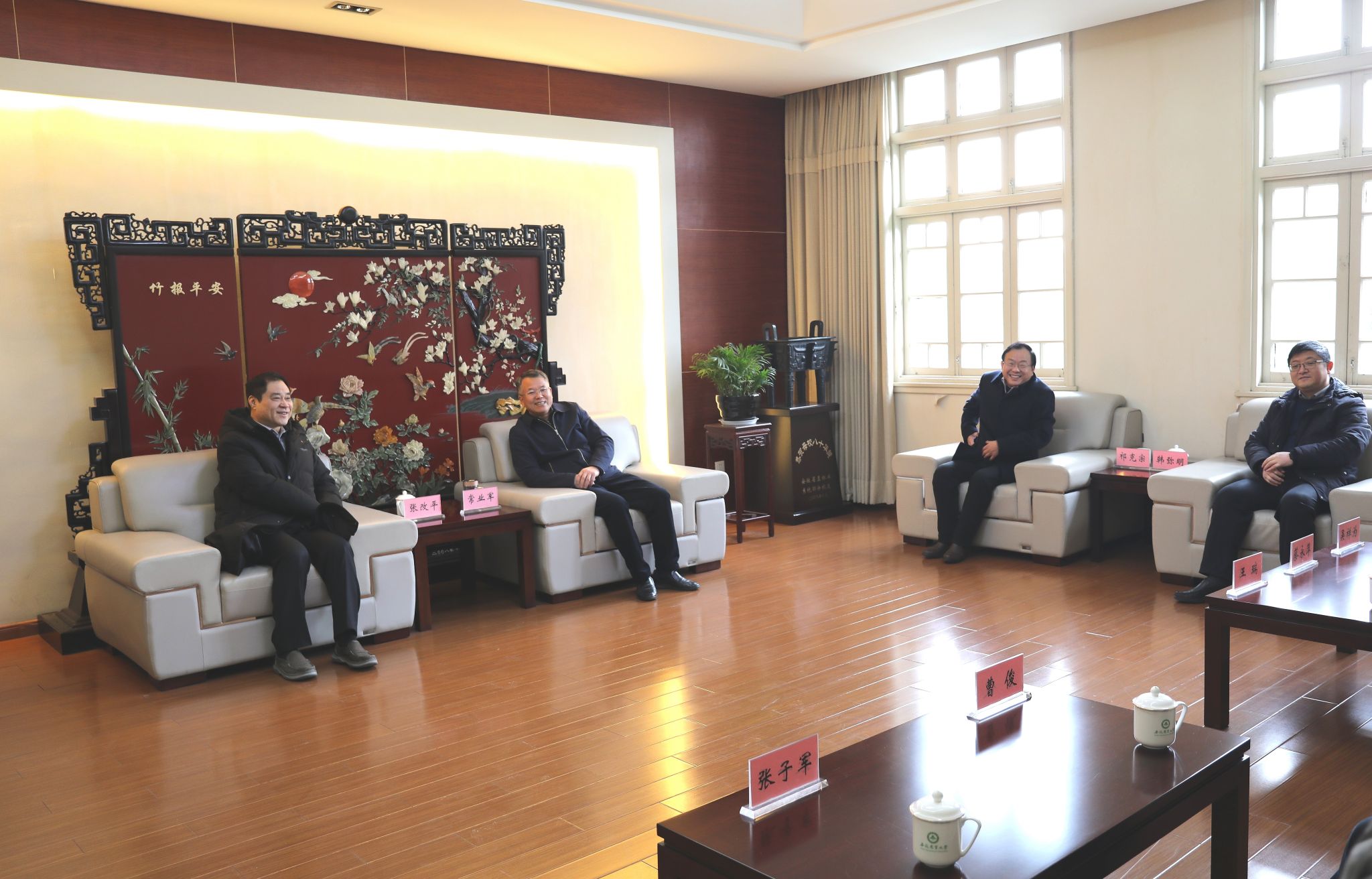 常业军向张改平一行来访表示欢迎,向张改平对学校的发展给予的关心支持表示感谢,重点介绍了学校在复合型人才培养、高层次人才引进、高水平科研平台建设等方面取得的新成效。双方就特色高水平农业大学建设、高层次人才引培工作进行了深入交流。