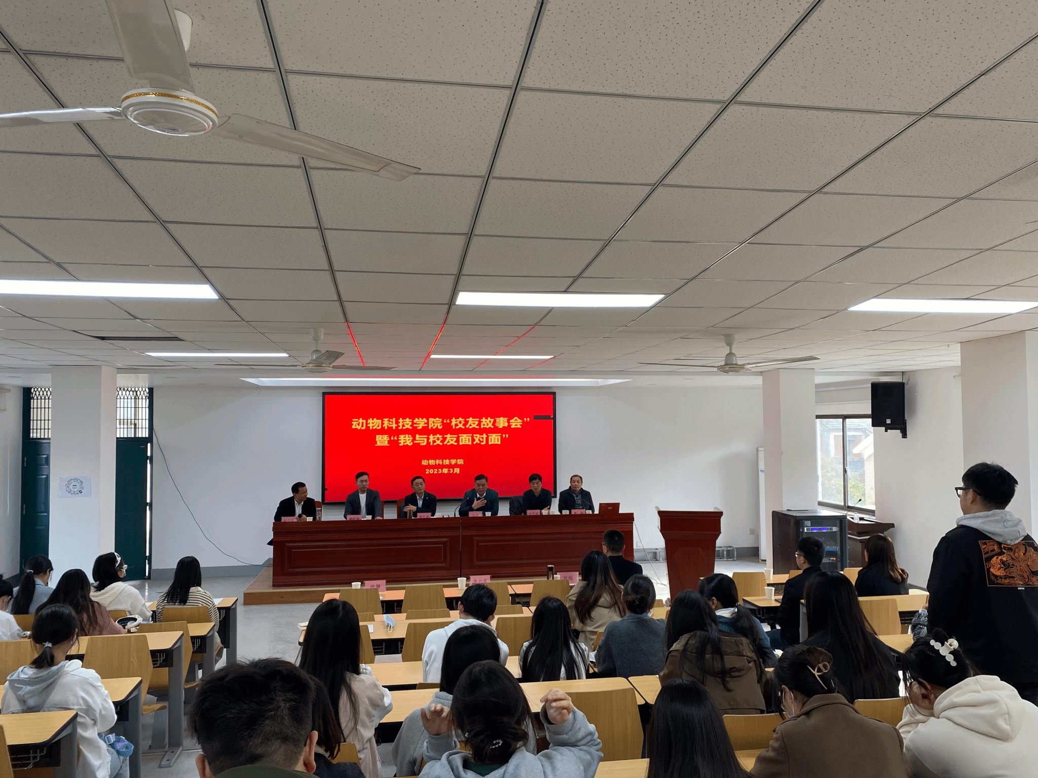 本网讯 3月27-28日下午,动物科技学院在学院318教室举办优秀校友报告会暨我与校友面对面活动。学院党委书记曹俊、院长张子军、党委副书记章巍,学院1986届校友合肥华仁农牧集团有限公司总裁张新、学院1988届校友普农集团子公司普济桑田负责人许平道、学院1989届校友上海瑞辰集团董事、上海爱侣宠物医院有限公司院长杨其清、学院1989届校友安徽华澳生物技术有限公司董事长李生龙、学院2003届校友新瑞鹏宠物医疗集团苏皖区总经理胡旺庭以及学生代表100余人参加此次活动。