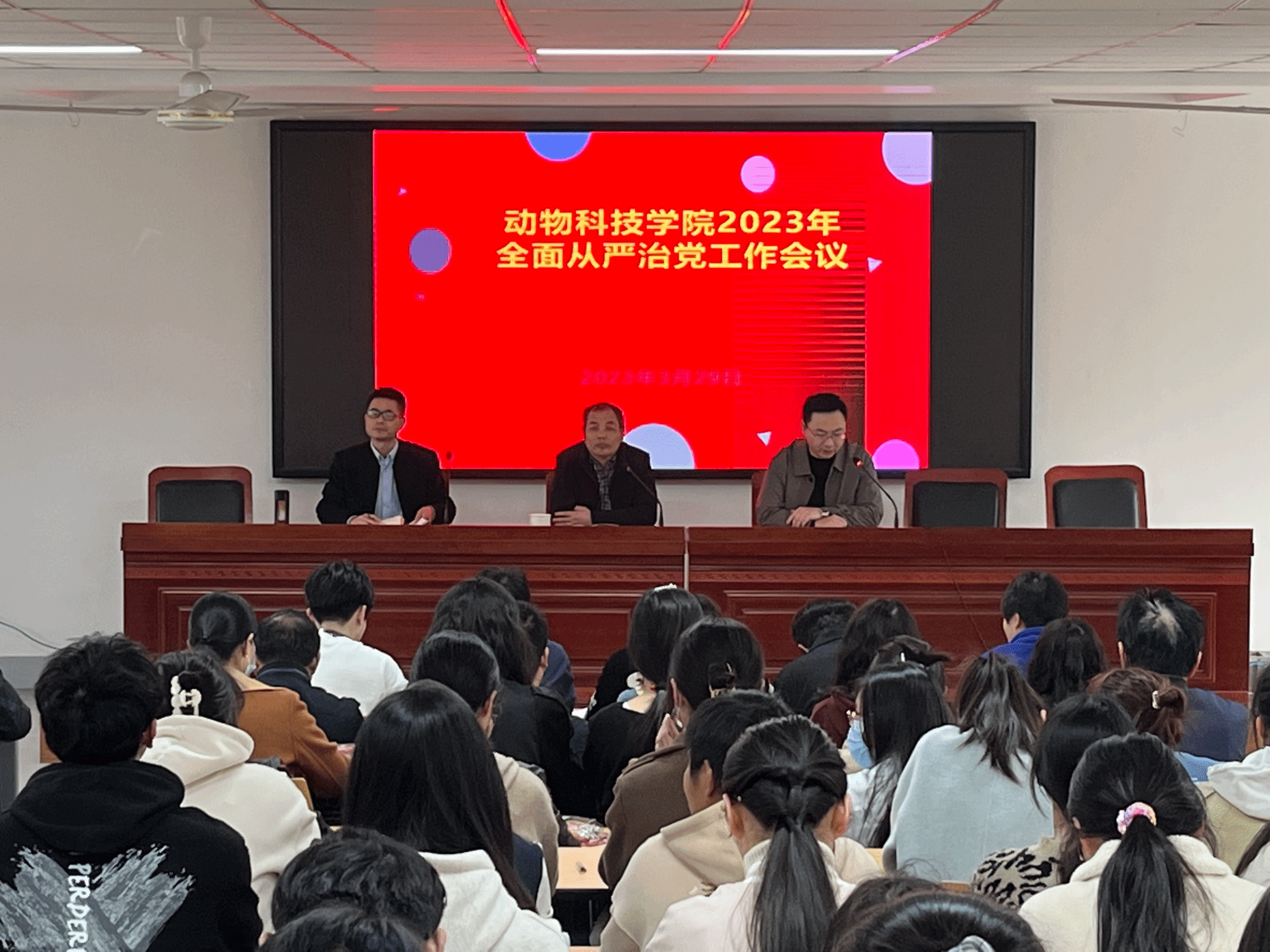 本网讯 3月29日,动物科技学院召开2023年全面从严治党会议,传达学习党的二十大精神和二十届中央纪委二次全会精神和学校2023年全面从严治党工作会议内容,部署2023年动物科技学院重点任务。学院党委书记曹俊作动员,学院党委副书记、纪委书记、副院长章巍开展案例教育。会议由学院党委委员、副院长涂健主持,学院领导班子成员、全体师生党员参加了大会。