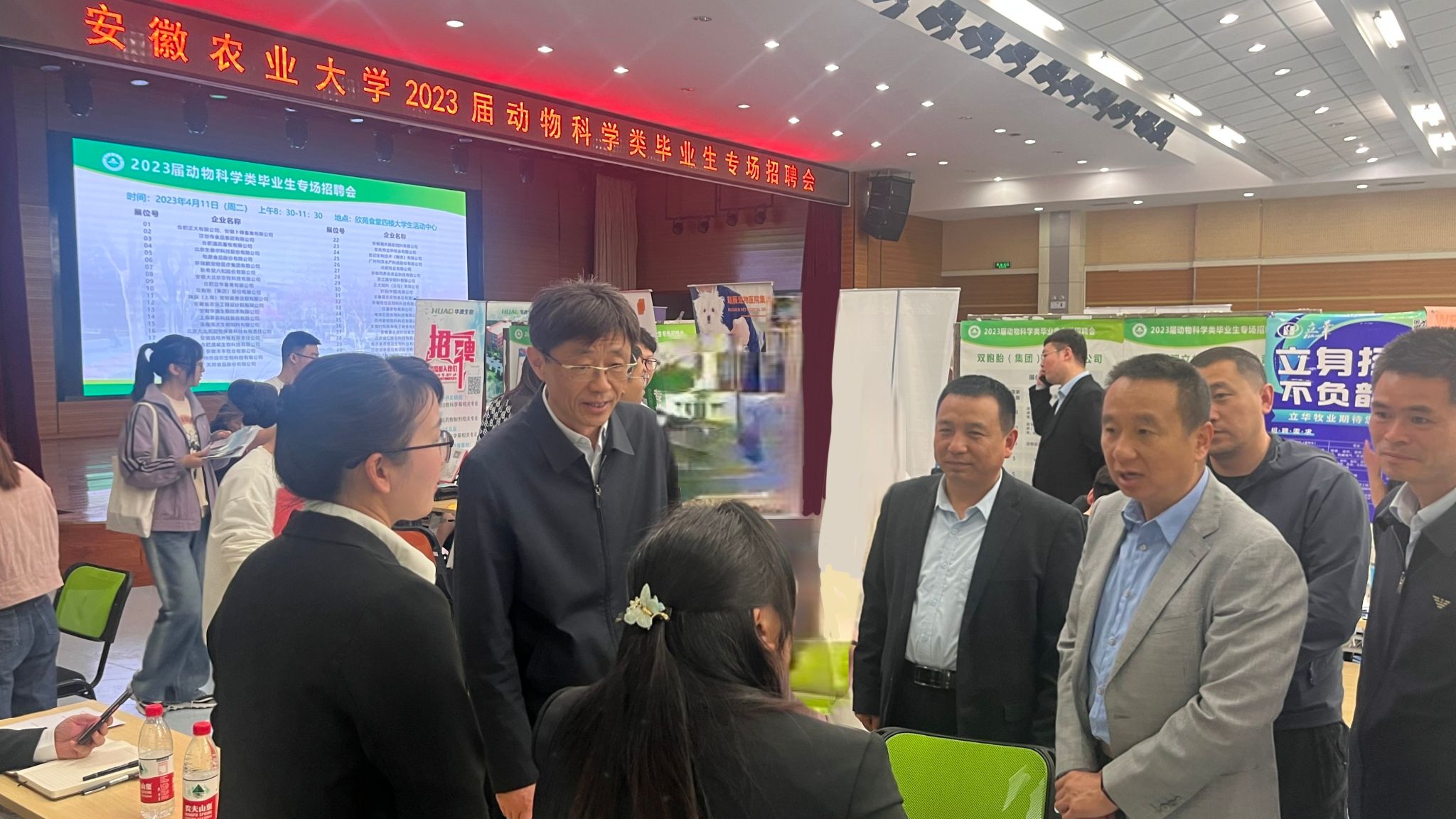 本网讯 4月11日上午,我校在欣苑四楼大学生活动中心举办2023届动物科学类专场招聘会。校党委常委、副校长韩军,招生就业处、动物科技学院有关领导到场访企拓岗,与用人单位、校友、毕业生亲切交谈。