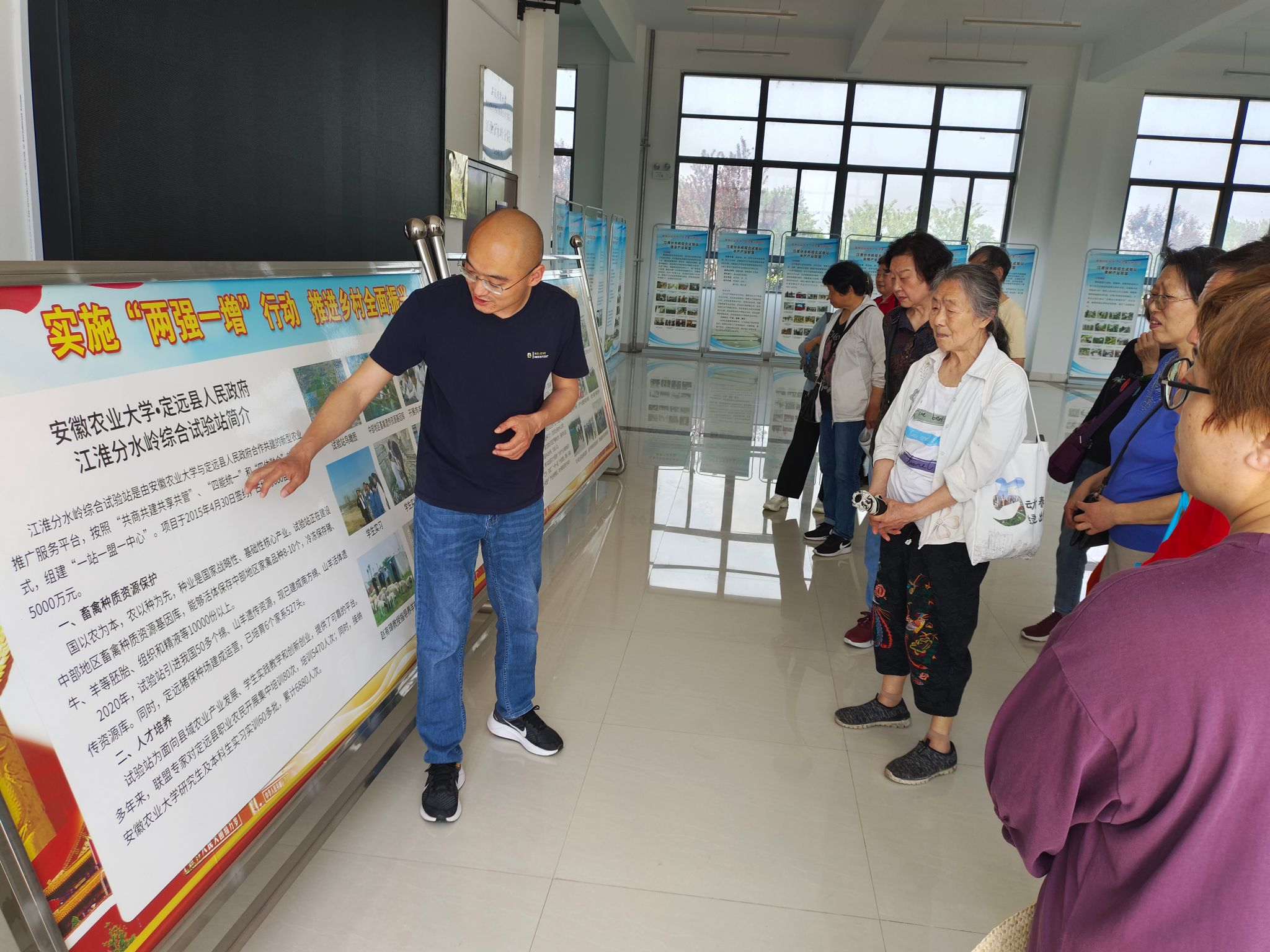 当日下午,组织退休教工一行前往定远县江淮分水岭综合试验站参观学习。听取了试验站工作人员关于稻渔共生示范基地,草牧业产业联盟示范基地,绵、山羊遗传资源活体库建设工作的讲解,参观了实验室并同驻站教师进行交流。