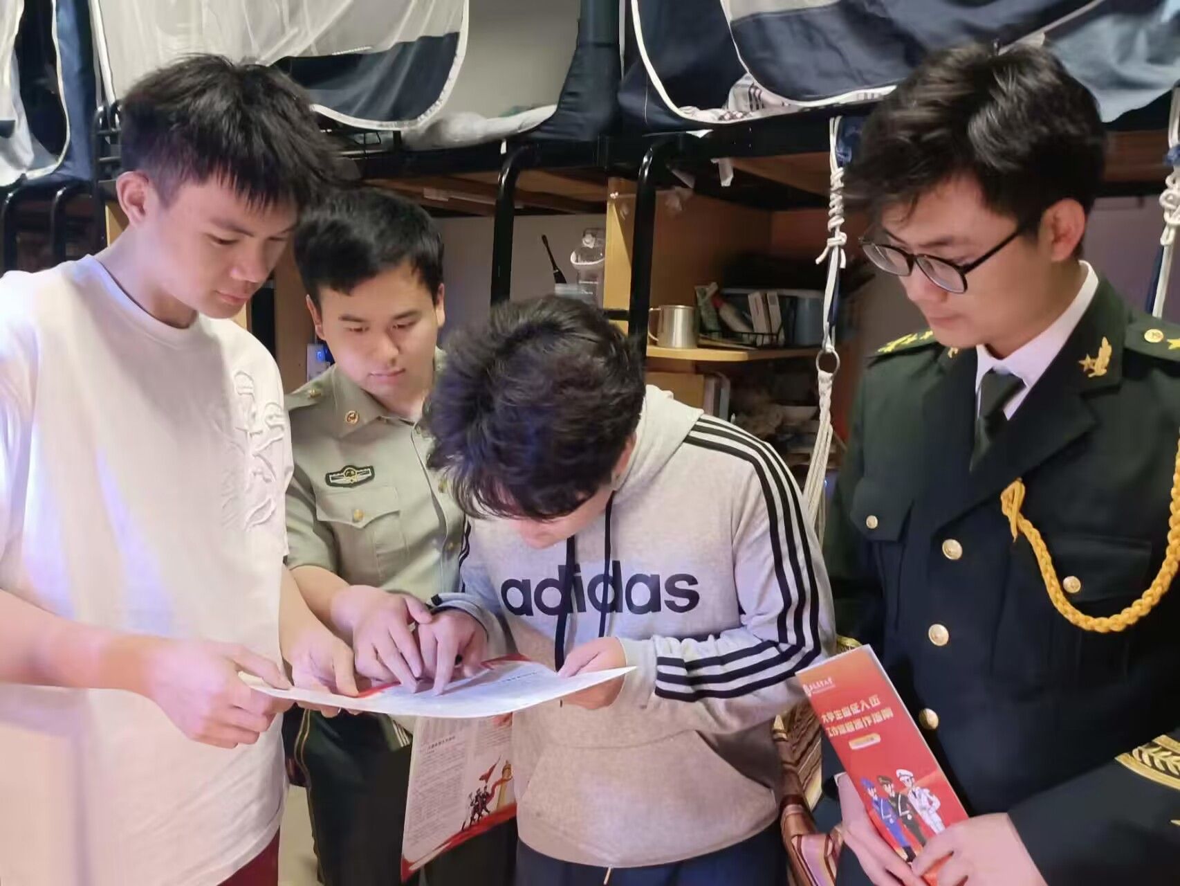 登楼入寝促交流。59日晚学院组织国旗护卫队队长赵鸿宇、优秀退役士兵杨卓兴等人深入学生宿舍向同学们科普入伍政策,分享部队生活。此次进寝,拉近了同学们之间的距离,也点燃了同学们心中应征入伍的热情,强化了同学们保家卫国,实现青春理想的责任感,为我院征兵入伍工作打下坚实的基础。