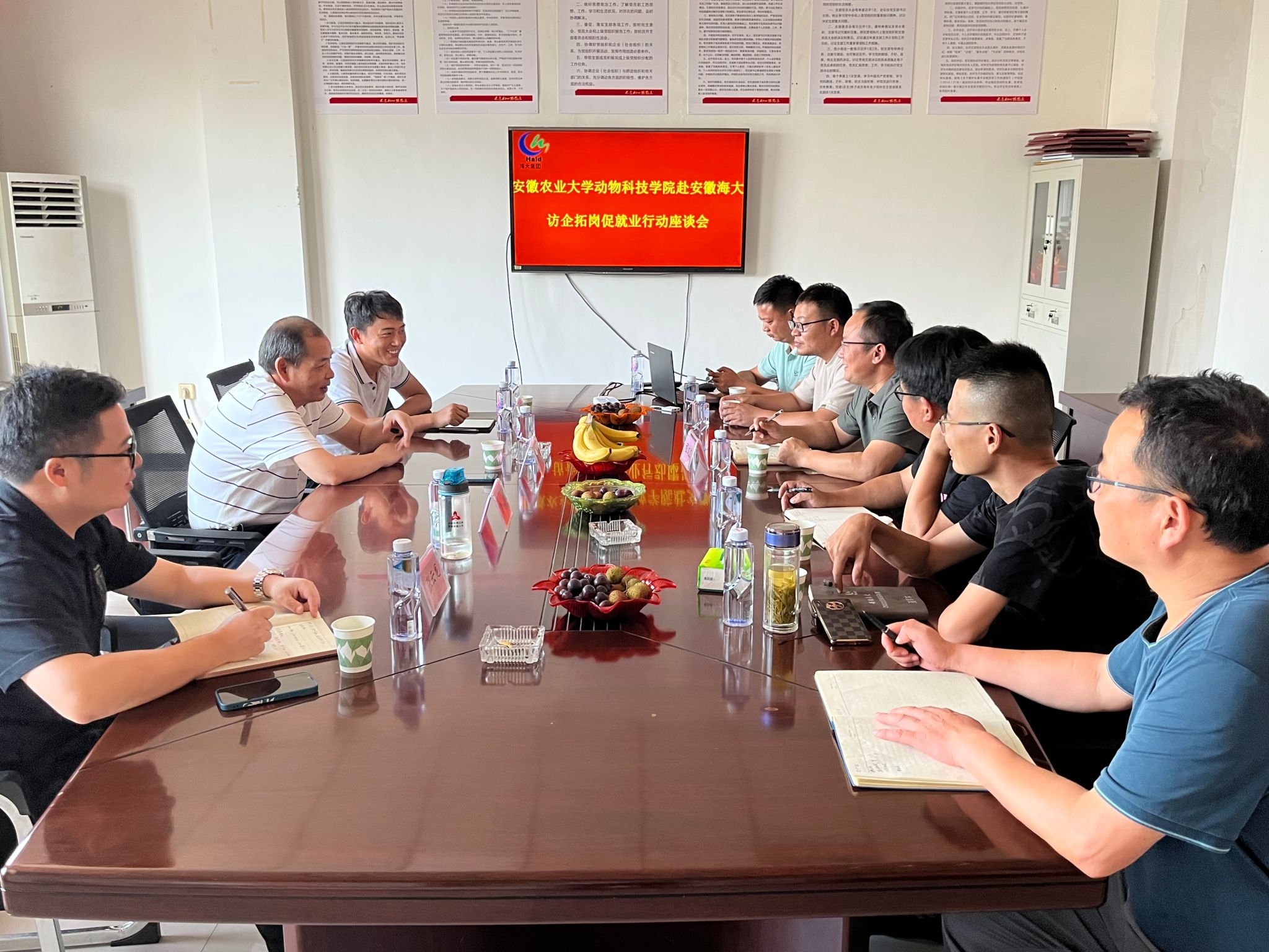 座谈会上,曹俊代表学院感谢企业对学院发展的关心与支持,介绍了学院在教学、科研、人才培养等方面的情况。安徽海大饲料有限公司总经理程文汇代表公司对学院领导老师的到访表示欢迎,感谢学院对企业发展提供的人才和科技支持,介绍了企业发展历程、业务范围及用人需求等情况,并对学院发展、专业建设、双方合作提出了建设性意见。双方还就实习实践、拓展就业、校企合作、成果转化等方面进行了深入的交流,达成了进一步合作共识。