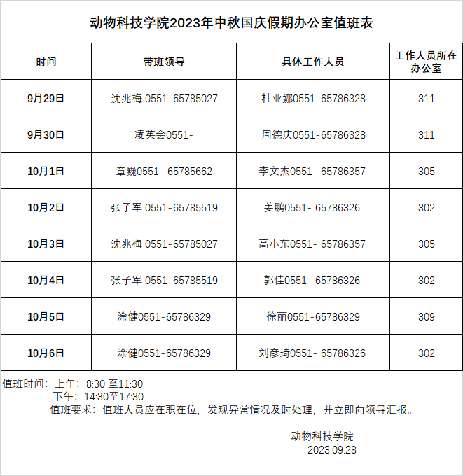 中秋、国庆节办公室值班安排