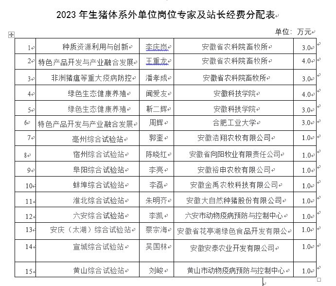安徽农业大学动物科技学院殷宗俊教授任安徽省生猪产业技术体系首席专家,协助安徽省农业农村厅开展全省生猪产业发展等事项,体系设有岗位专家及站长岗位,依据2023安徽省生猪产业技术体系科技服务委托协议,需向对方单位拨付合作经费,具体内容如下表。按照《安徽农业大学科研项目外拨经费管理暂行办法》规定进行公示,公示3天,时间为2023年10月19日-10月23日,如有异议,请在公示期内向动科楼311学院办公室反映。联系人:凌英会 杜亚娜 联系电话:0551-65786328。2023年10月19日