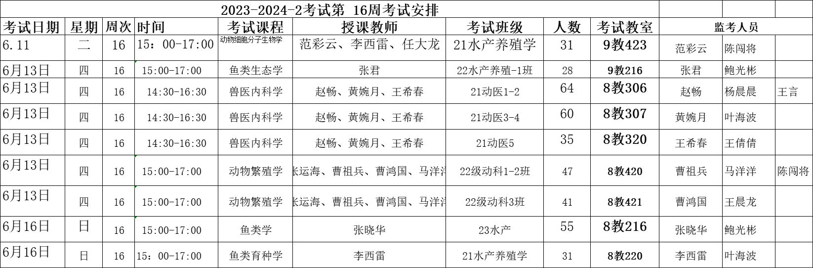 第16周考试安排