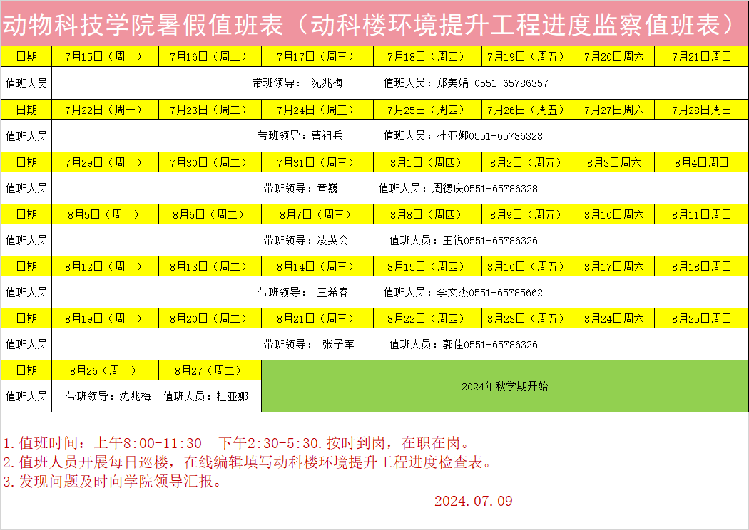 2024年暑假值班表
