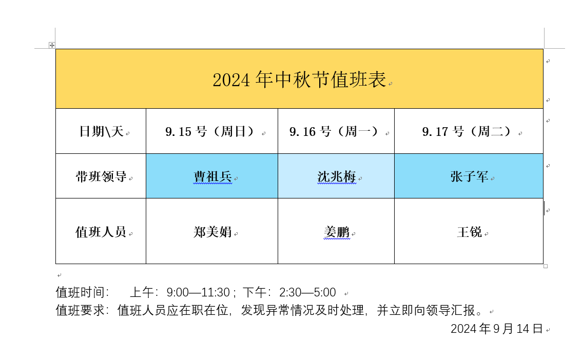 中秋节办公室值班表
