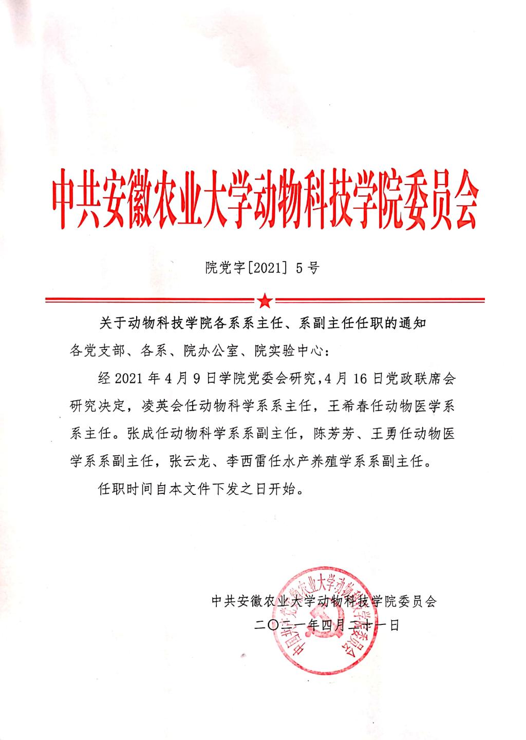 关于动物科技学院各系系主任、系副主任任职的通知