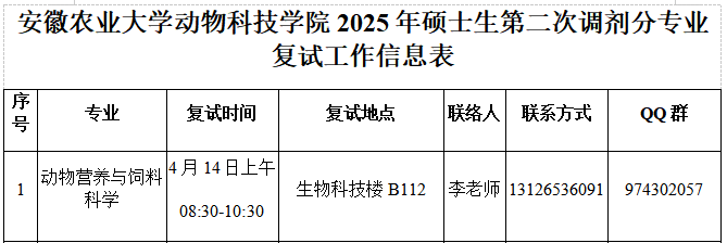 安徽农业大学动物科技学院2025年硕士研究生第二次调剂分专业复试工作信息表(动物营养与饲料科学专业)