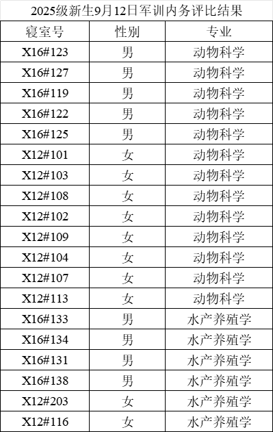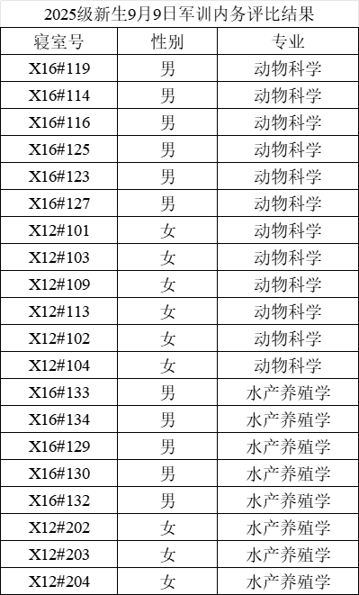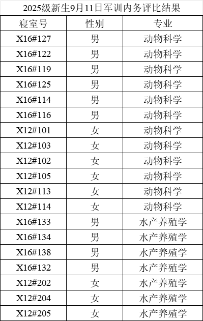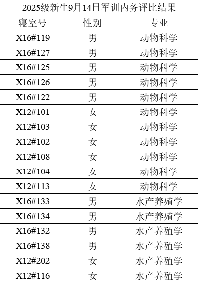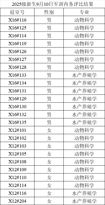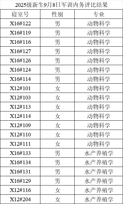 各2025级新生班级:根据学院检查评比,现将优秀军训内务宿舍公布如下:如有异议,请在公示期内向学院反馈,逾期不再受理。公示时间:2025年9月14日-15日,联系电话:0551-65785662动物科技学院2025年9月14日