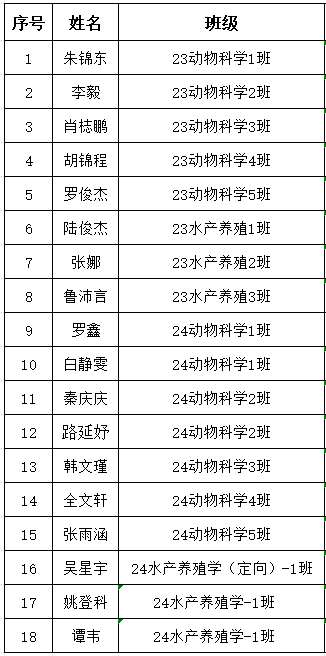 根据《中国共产主义青年团发展团员工作细则》(中青发〔2023〕13号)文件要求,经学生申请,团支部推荐,学院分团校结业考核,学院团委综合考察,现将拟推荐发展团员名单公示如下:公示时间:2025年10月31日—11月6日公示期内,若有异议,请于2025年11月6日17:00之前以书面形式向动物科技学院反映。联系人:侯老师联系电话:0551-65786326邮箱:1047469763@qq.com 动物科技学院团委2025年10月31日