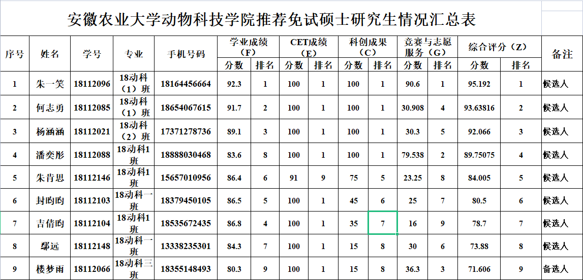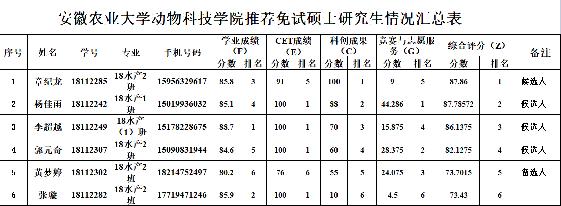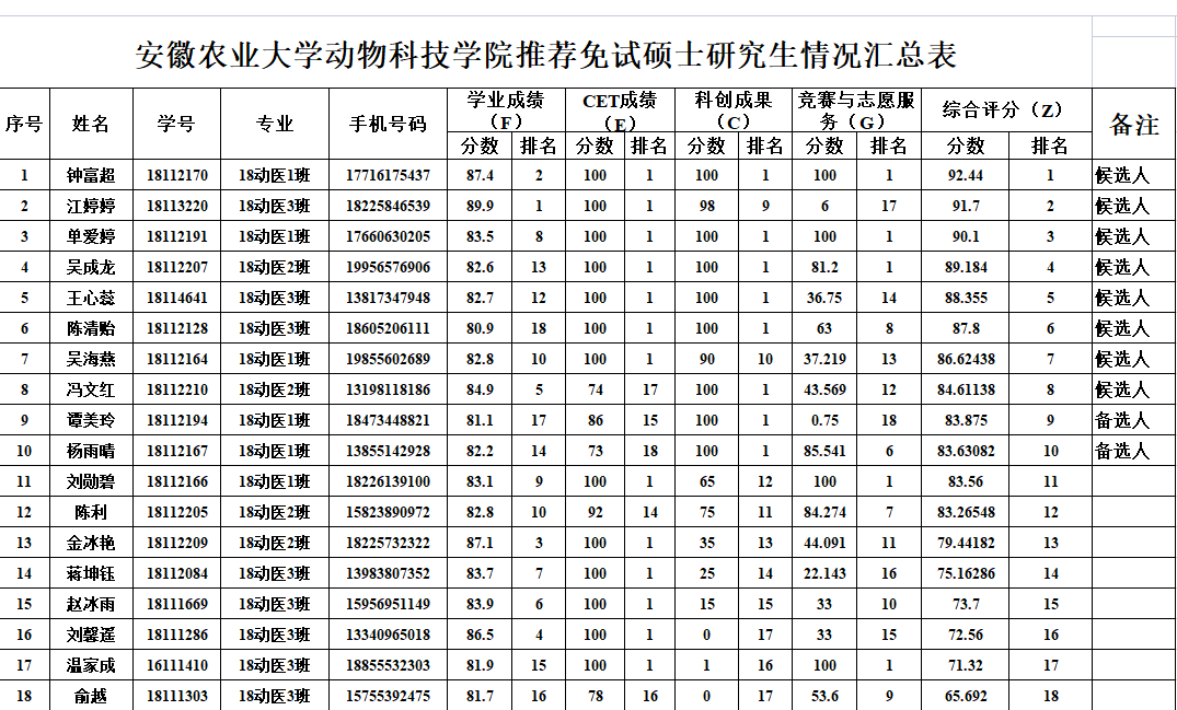 安徽农业大学动物科技学院推荐免试硕士研究生情况汇总表