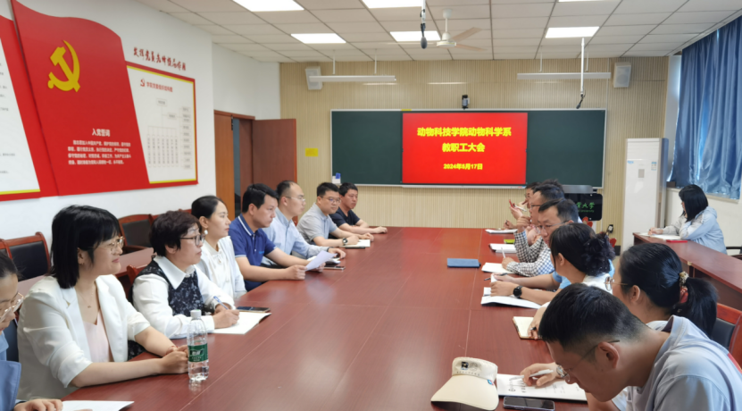 曹祖兵通报了动物科学系研究生导师招生资格审核、开题与中期考核、学位论文盲审、学位论文抽查、论文答辩安排、就业以及2024版本科人才培养方案修订等方面的情况及近期工作安排。张成通报了动物科学系本科教育教学审核评估、一流专业建设、本科毕业实习、本科毕业论文答辩等方面的开展情况及近期工作安排。动物科学系教工党支部书记朱雯通报了近期支部的工作情况。