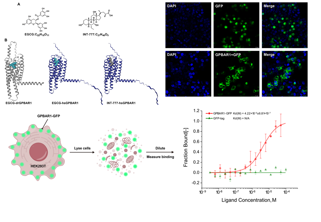 此外,为了揭示EGCG影响草鱼摄食和代谢的机制,对草鱼肝细胞进行了转录组分析。结果发现瘦素Leptin和G蛋白偶联胆汁酸受体1(GPBAR1)是细胞转录组差异表达基因中的关键候选基因。在体实验表明,EGCG诱导释放的瘦素可能在其摄食量和食欲调节中起关键作用。分子对接和MST分析表明,GPBAR1为EGCG潜在的膜受体,介导其对代谢的调节作用。因此,含有高水平EGCG的植物源性产品可作为调节外周葡萄糖稳态的绿色饲料添加剂。